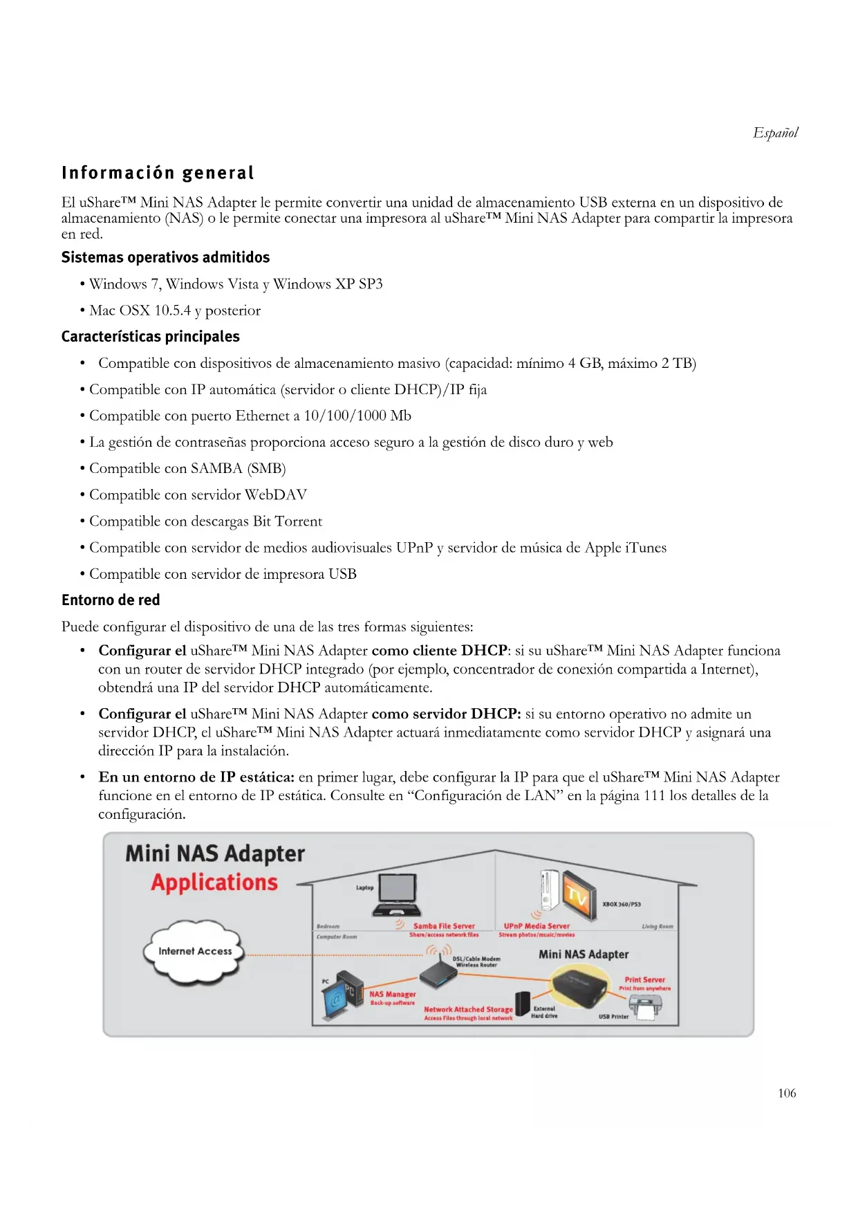 Español Información general El uShare™ Mini NAS Adapter le permite convertir una unidad de almacenamiento USB externa en un dispositivo de almacenamiento (NAS) o le permite conectar una impresora al uShare™ Mini NAS Adapter para compartir la impresora en red. Sistemas operativos admitidos