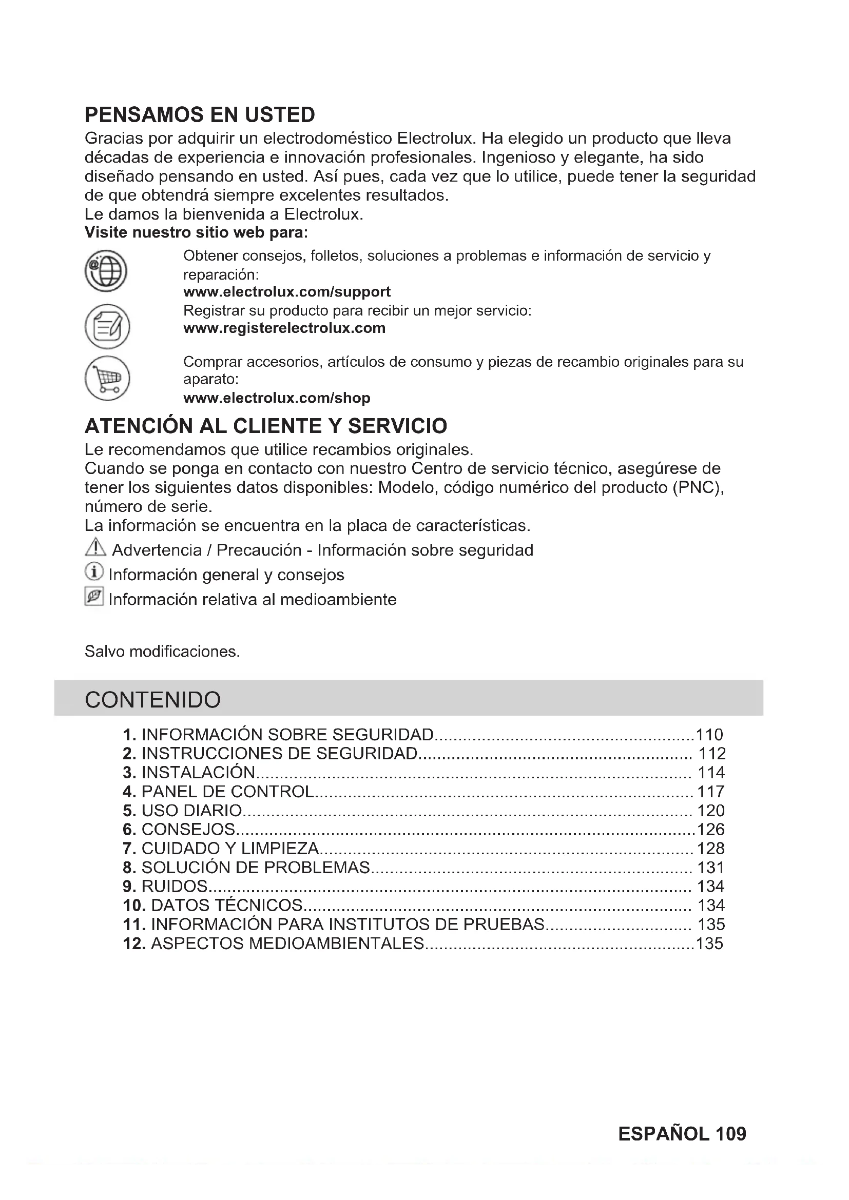 Le recomendamos que utilice recambios originales. Cuando se ponga en contacto con nuestro Centro de servicio técnico, asegúrese de tener los siguientes datos disponibles: Modelo, código numérico del producto (PNC), número de serie. La información se encuentra en la placa de características. Advertencia / Precaución - Información sobre seguridad Información general y consejos Información relativa al medioambiente Salvo modificaciones. CONTENIDO