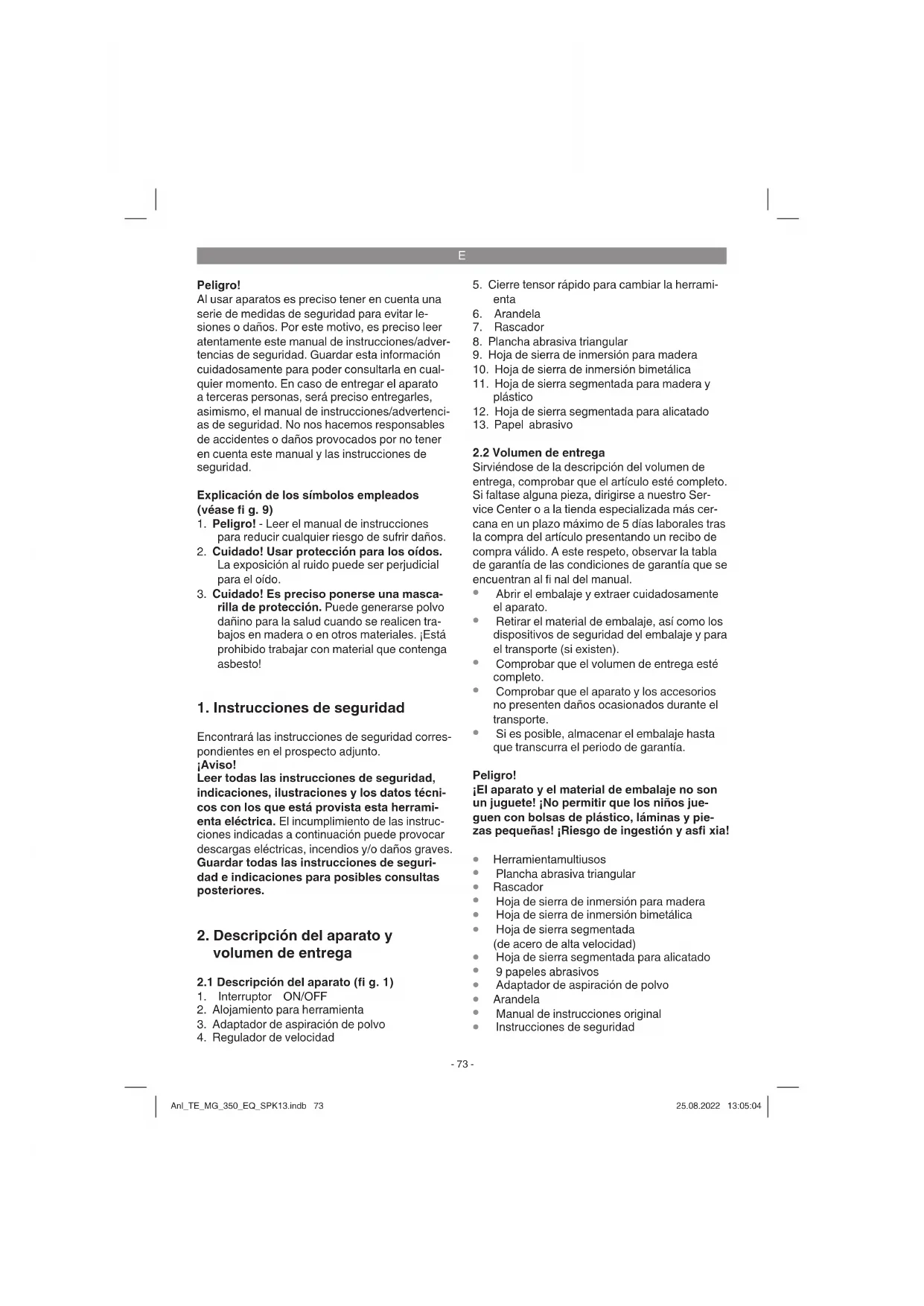 Después de una parada por sobrecarga, el aparato vuelve a ponerse en marcha au- tomáticamente. Herramientas insertables Serrar: serrar madera y plástico. Instrucciones relativas al trabajo: Al serrar comprobar que no haya cuerpos extraños en el material y, en caso necesario, retirarlos. En el serrado de inmersión solo se pueden traba- jar materiales blandos como madera o placas de yeso encartonado. Lijar: lijar superfi cies en bordes, esquinas o zonas de difícil acceso. Dependiendo de la hoja abrasiva, utilizar para lijar madera, pintura, barniz, etc. Instrucciones relativas al trabajo: Esta herra- mienta resulta especialmente efi ciente a la hora Anl_TE_MG_350_EQ_SPK13.indb 75Anl_TE_MG_350_EQ_SPK13.indb 75 25.08.2022 13:05:0425.08.2022 13:05:04E