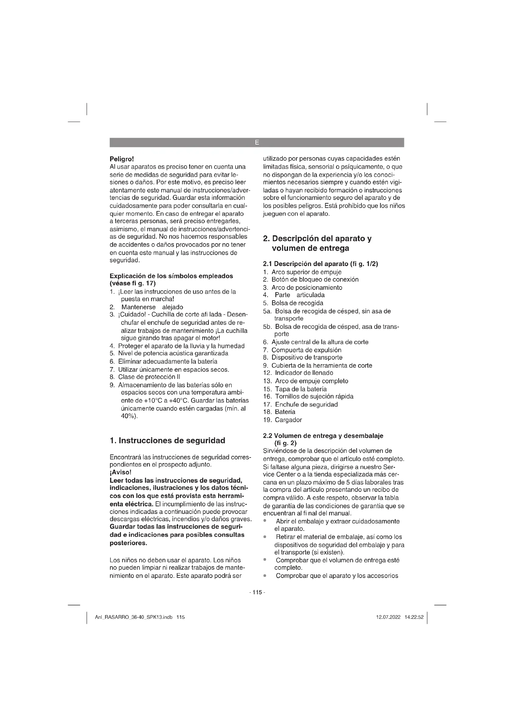 y la batería a nuestro servicio de asistencia técnica. Para realizar un envío adecuado, ponerse en contacto con nuestro servicio de asistencia técnica o con el punto de venta en el que se compró el aparato. Para el envío o la eliminación de baterías o del aparato, estos deben embalarse por separado en bolsas de plástico para evitar cortocircuitos e incendios. Es preciso recargar siempre a tiempo la batería para procurar que dure lo máximo posible. Ha- cerlo es imprescindible también en cuanto se detecta que disminuye el rendimiento del aparato. No descargar jamás la batería por completo. Esto podría provocar un defecto en la batería. Indicador de capacidad de batería (fi g. 13) Pulsar el interruptor para acceder al indicador de capacidad de la batería (pos. A). El indicador de capacidad de batería (pos. B) le indica el estado de carga de la batería sirviéndose de 3 LED. Si los 3 LED están iluminados: La batería está completamente cargada. Si están iluminados 1 o 2 LED: La batería dispone de sufi ciente carga residual. Si 1 LED parpadea: La batería está vacía, es preciso cargarla. Si todos los LED parpadean: La temperatura de la batería es demasiado baja. Quitar la batería del aparato y dejarla durante un día a temperatura ambiente. Si vuelve a aparecer el fallo, la batería se ha descargado completa- mente y está defectuosa. Quitar la batería del aparato. Está prohibido emplear o cargar una batería defectuosa. Montaje de la batería (fi g. 14) Abrir la tapa de la batería. A continuación, insertar las dos baterías en los alojamientos como se indi- ca en la fi g. 14. ¡Advertencia! Utilizar sólo baterías con el mismo nivel de carga, no combinar nunca baterías totalmente cargadas y baterías cargadas a la mitad. Cargar siempre las dos baterías a la vez. La batería con el nivel de carga inferior determina el tiempo de funcionamiento del aparato. Las dos baterías deben estar cargadas completamente antes de poner el aparato en funcionamiento. Cerrar la tapa de la batería plegándola. Anl_RASARRO_36-40_SPK13.indb 118Anl_RASARRO_36-40_SPK13.indb 118 12.07.2022 14:22:5312.07.2022 14:22:53E