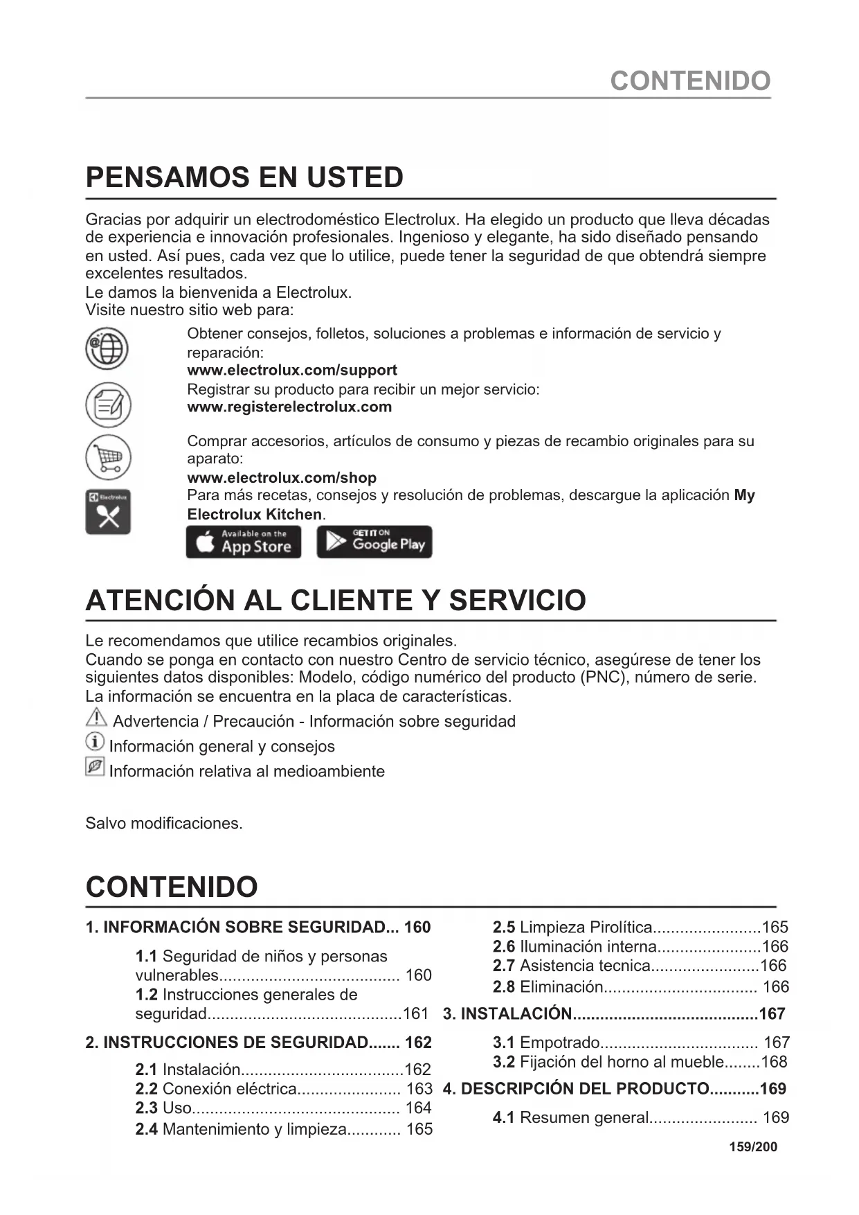 Gracias por adquirir un electrodoméstico Electrolux. Ha elegido un producto que lleva décadas de experiencia e innovación profesionales. Ingenioso y elegante, ha sido diseñado pensando en usted. Así pues, cada vez que lo utilice, puede tener la seguridad de que obtendrá siempre excelentes resultados. Le damos la bienvenida a Electrolux. Visite nuestro sitio web para: Obtener consejos, folletos, soluciones a problemas e información de servicio y reparación: www.electrolux.com/support Registrar su producto para recibir un mejor servicio: www.registerelectrolux.com Comprar accesorios, artículos de consumo y piezas de recambio originales para su aparato: www.electrolux.com/shop Para más recetas, consejos y resolución de problemas, descargue la aplicación My Electrolux Kitchen.