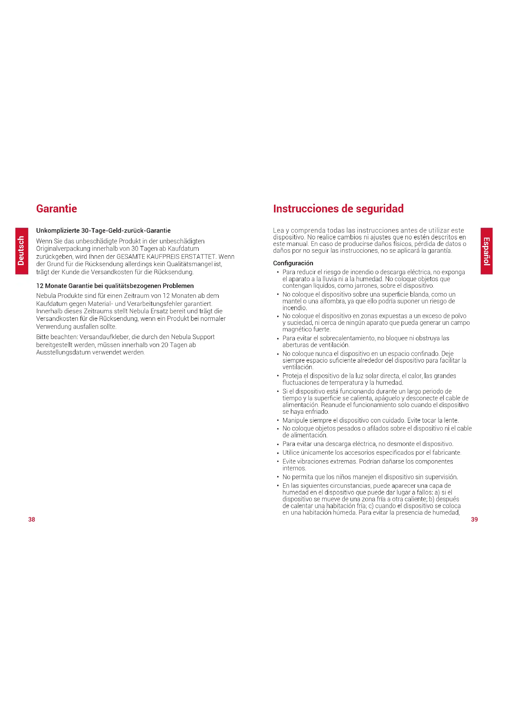 Español Garantía Garantía de devolución del dinero de 30 días por cualquier motivo Puede devolver el producto y el embalaje intactos en un plazo de 30 días desde la compra para recibir un REEMBOLSO COMPLETO por cualquier razón. Si el motivo de la devolución no está relacionado con la calidad, el cliente deberá pagar los gastos de envío de la devolución. 12 meses de garantía ante problemas de calidad Nebula ofrece una garantía de 12 meses a partir de la fecha de compra para cualquier defecto de material o fabricación del producto. Dentro de este periodo, Nebula proporcionará una sustitución y se hará cargo de cualquier gasto de envío relacionado con los productos que no ofrezcan un uso normal. Nota: Las etiquetas de envío suministradas deben usarse en un plazo de 20 días a partir de su fecha de emisión por parte del equipo de asistencia de Nebula. Consignes de sécurité Veuillez lire et comprendre toutes les instructions avant d’utiliser cet appareil. N’apportez pas de modifications ou de paramètres qui ne sont pas décrits dans ce manuel. En cas de lésions corporelles, de pertes de données ou de dommages pour cause de non-respect des instructions, la garantie ne s’applique pas. Conguration