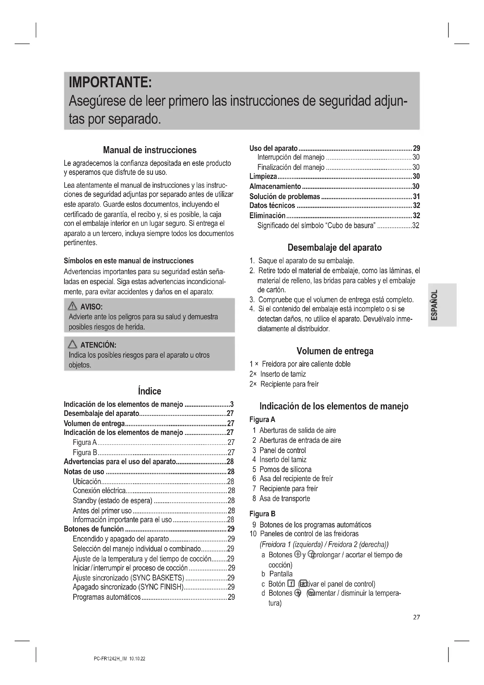 detectan daños, no utilice el aparato. Devuélvalo inme- diatamente al distribuidor. Volumen de entrega 1 × Freidora por aire caliente doble 2× Inserto de tamiz 2× Recipiente para freír Indicación de los elementos de manejo Figura A 1 Aberturas de salida de aire 2 Aberturas de entrada de aire 3 Panel de control 4 Inserto del tamiz 5 Pomos de silicona 6 Asa del recipiente de freír 7 Recipiente para freír 8 Asa de transporte Figura B 9 Botones de los programas automáticos 10 Paneles de control de las freidoras (Freidora 1 (izquierda) / Freidora 2 (derecha)) a Botones y (prolongar / acortar el tiempo de cocción) b Pantalla c Botón / (activar el panel de control) d Botones y (aumentar / disminuir la tempera- tura)PC-FR1242H_IM 10.10.22