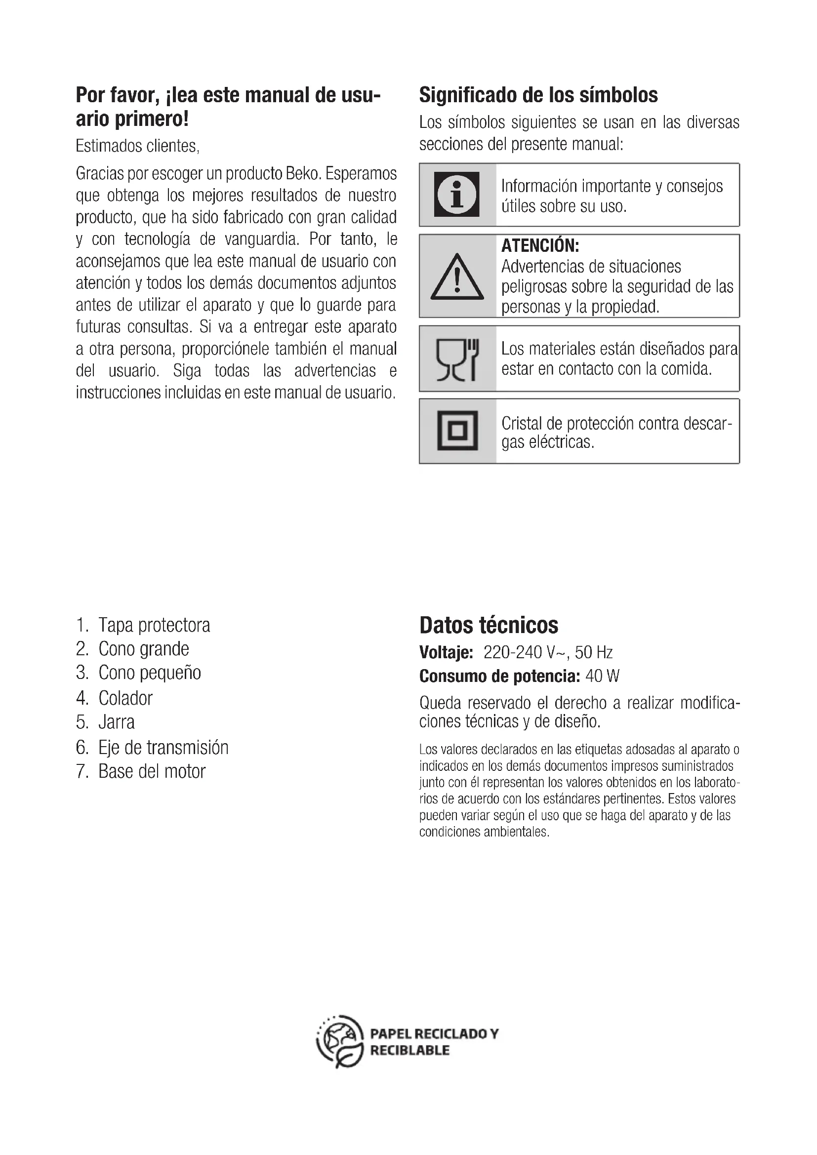 GARANTİ BELGESİPor favor, ¡lea este manual de usu- ario primero! Estimados clientes,Gracias por escoger un producto Beko. Esperamos que obtenga los mejores resultados de nuestro producto, que ha sido fabricado con gran calidad y con tecnología de vanguardia. Por tanto, le aconsejamos que lea este manual de usuario con atención y todos los demás documentos adjuntos antes de utilizar el aparato y que lo guarde para futuras consultas. Si va a entregar este aparato a otra persona, proporciónele también el manual del usuario. Siga todas las advertencias e instrucciones incluidas en este manual de usuario. Significado de los símbolos Los símbolos siguientes se usan en las diversas secciones del presente manual: Información importante y consejos útiles sobre su uso. ATENCIÓN: Advertencias de situaciones peligrosas sobre la seguridad de las personas y la propiedad.Los materiales están diseñados para estar en contacto con la comida.Cristal de protección contra descar-gas eléctricas.