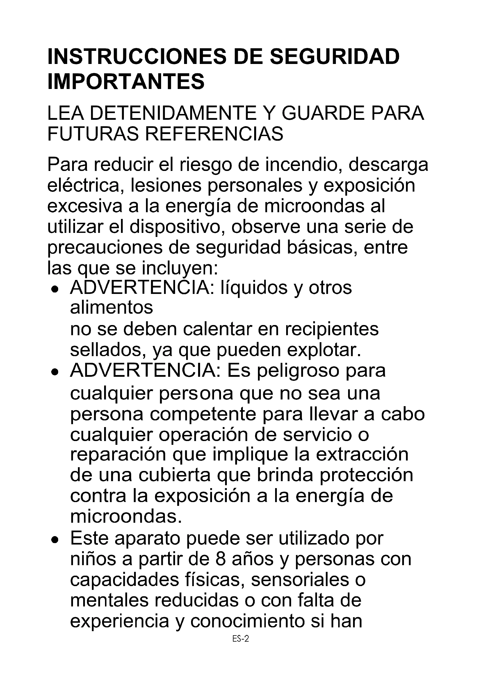 FUTURAS REFERENCIAS Para reducir el riesgo de incendio, descarga eléctrica, lesiones personales y exposición excesiva a la energía de microondas al utilizar el dispositivo, observe una serie de precauciones de seguridad básicas, entre las que se incluyen:
