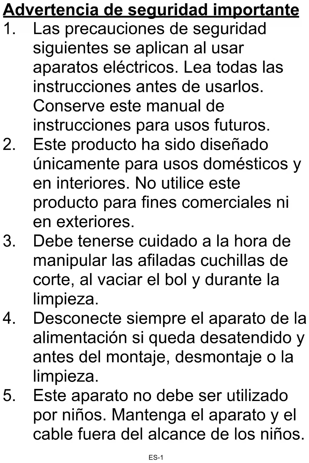 Mantenga las manos y utensilios fuera del recipiente cuando licue para reducir el riesgo de lesiones personales graves o daños a la licuadora. Se puede utilizar un raspador, pero únicamente cuando la licuadora no esté enES-6 funcionamiento (no aplicable a raspadores aceptables que formen parte del aparato).