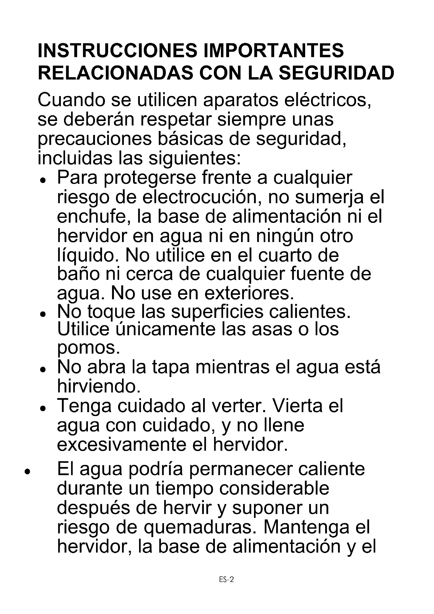 Para protegerse frente a cualquier riesgo de electrocución, no sumerja el enchufe, la base de alimentación ni el hervidor en agua ni en ningún otro líquido. No utilice en el cuarto de baño ni cerca de cualquier fuente de agua. No use en exteriores.