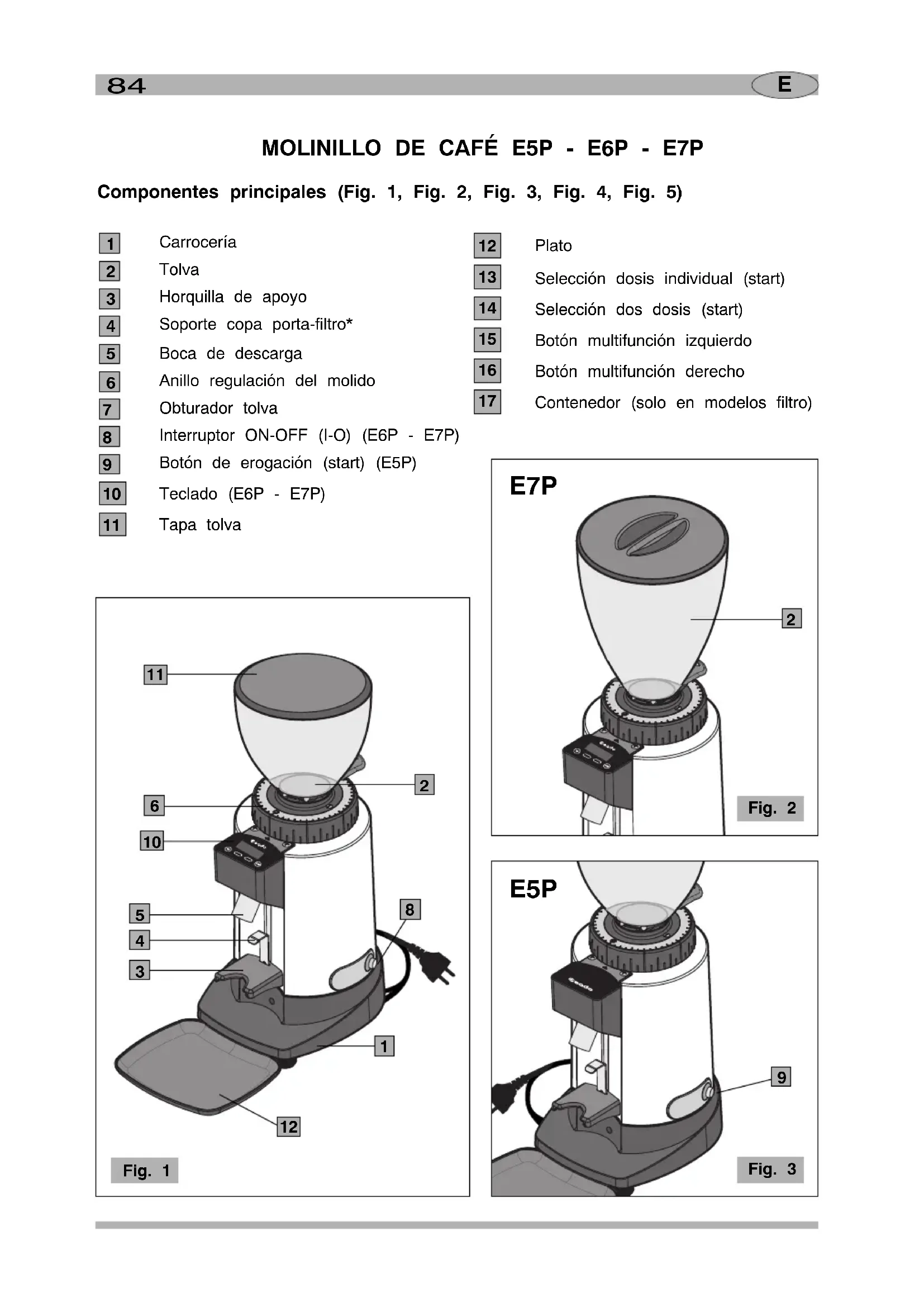 Carrocería Tolva Horquilla de apoyo Soporte copa porta-filtro* Boca de descarga Anillo regulación del molido Obturador tolva Interruptor ON-OFF (I-O) (E6P - E7P) Botón de erogación (start) (E5P) Teclado (E6P - E7P) Tapa tolva