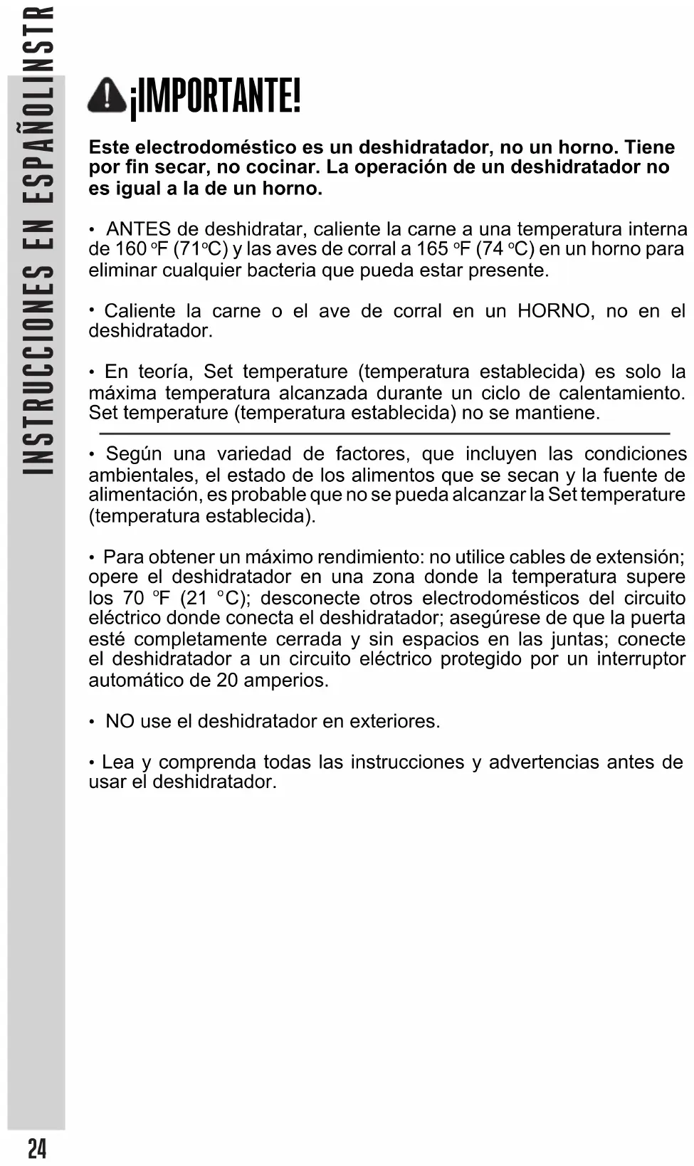 INSTRUCCIONES EN ESPAÑOLINSTRUCCIONES EN ESPAÑOLAl igual que con la mayoría de los métodos de cocción, una buena preparación es fundamental para tener éxito. Siguiendo algunas pautas básicas aumentará en gran medida la calidad del producto deshidratado y disminuirá el tiempo requerido para hacerlo. NOTA: Antes de deshidratar, caliente la carne a una temperatura interna de 160