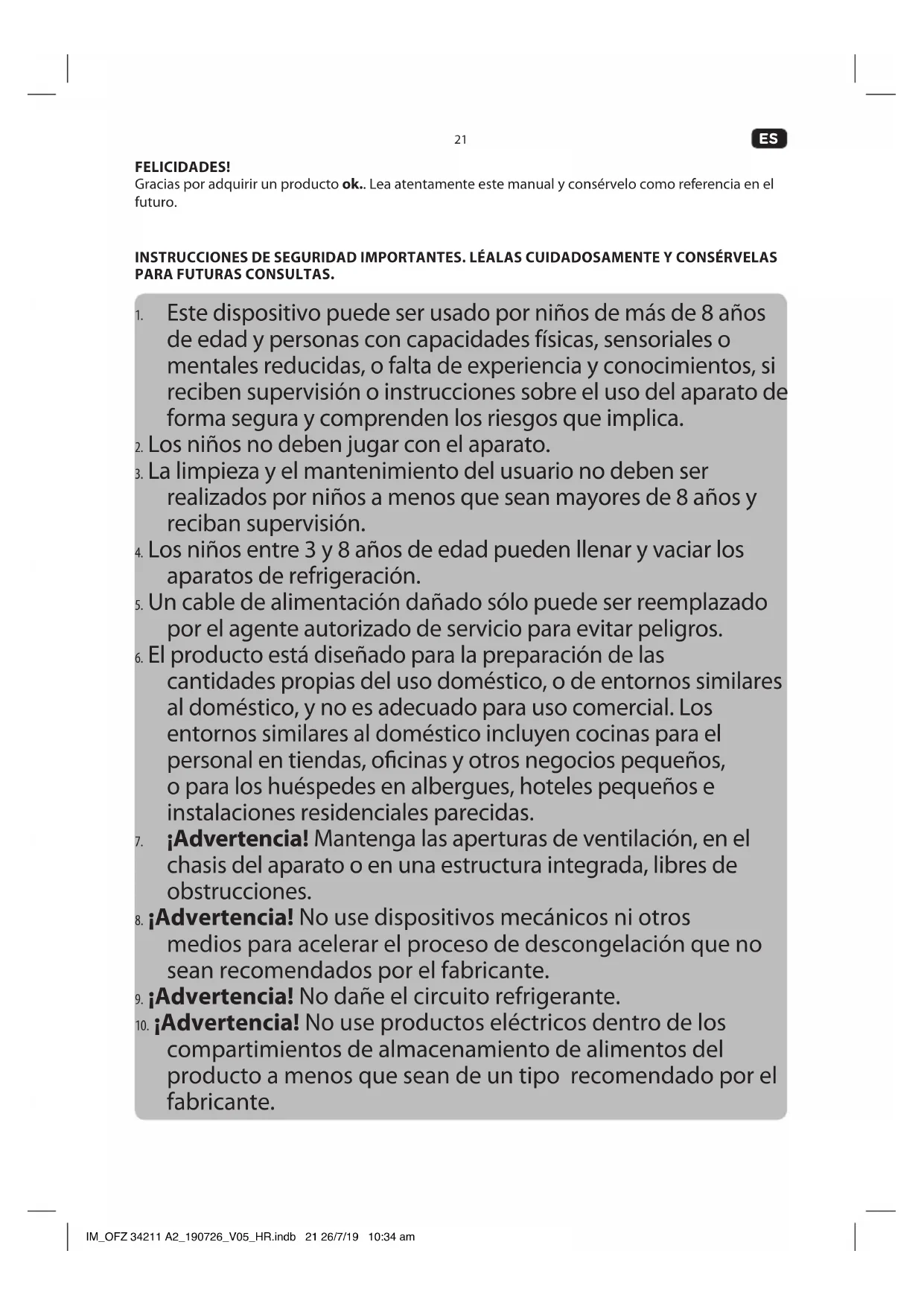 - Cada vez que se mueva el producto, debe dejarse reposar sin enchufar al menos 6 hrs antes de usarlo de nuevo para permitir que el sistema de enfriamiento llegue a su plena capacidad. IM_OFZ 34211 A2_190726_V05_HR.indb 24 26/7/19 10:34 am25