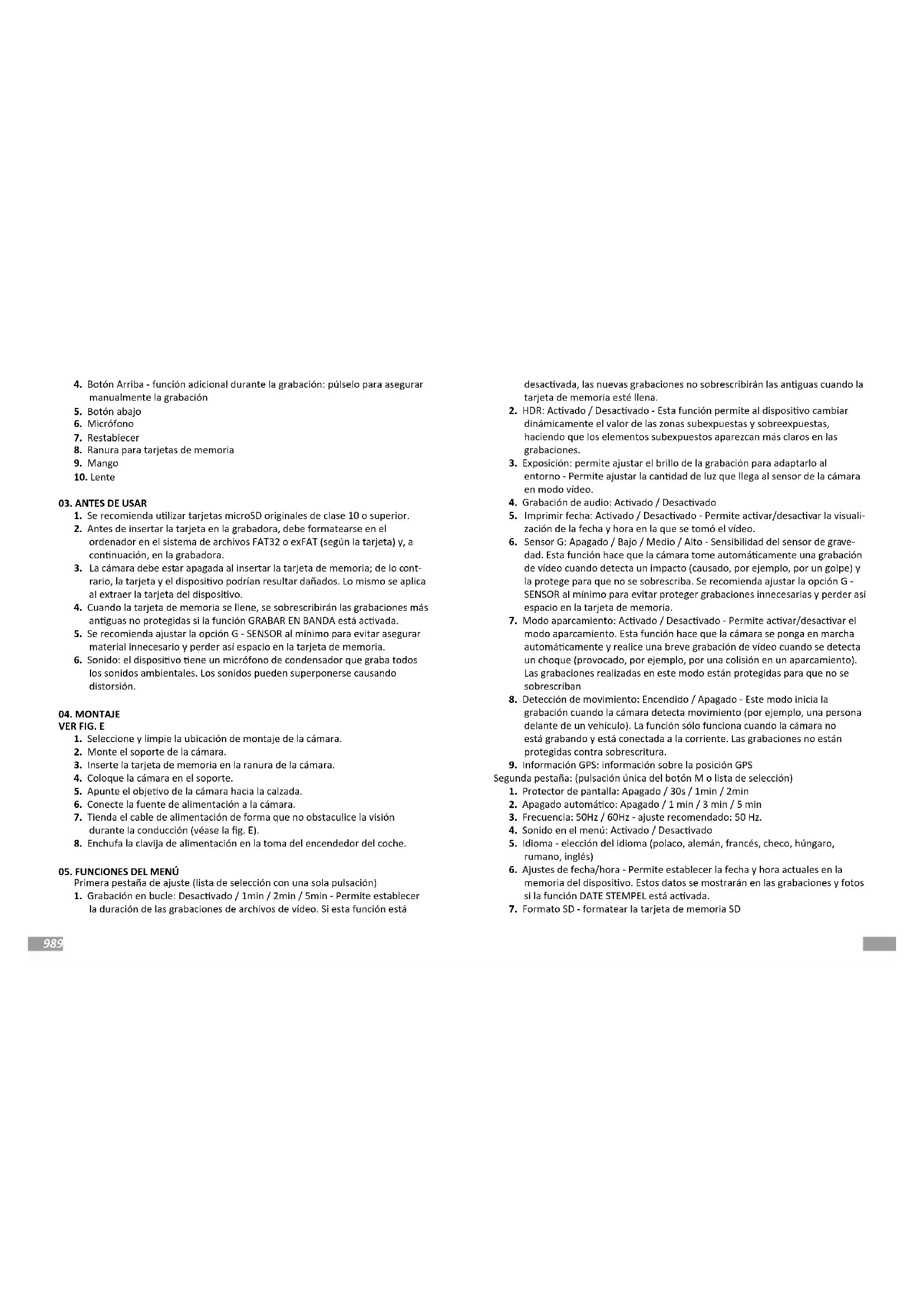Desengrase bien las supercies antes de montar el soporte en el cristal. No olvide evitar las altas temperaturas, que pueden deformar el soporte y dañar la propia grabadora. NOTAS: - G-SENSOR - una función gracias a la cual las grabaciones con sobrecargas registradas (por ejemplo, un rme irregular, un frenazo, la salida de un bordillo o un badén, etc.) están protegidas para que no se sobrescriban. Si el usuario uliza esta función, la tarjeta de memoria debe formatearse periódicamente en el ordenador y después en la cámara. En última instancia, cada archivo del soporte de datos estará protegido para que no se sobrescriba y el disposivo no podrá grabar otro recorrido, es decir, no grabará en bucle. Le aconsejamos que ajuste el sensor en función de su eslo de conducción y de las condiciones de la carretera. Esta opción también se puede desacvar por completo, en cuyo caso cada archivo más anguo se sobrescribirá y no será necesario formatear la tarjeta periódicamente. - MODO PARKING/MONITOR - una función diseñada para operar mientras el vehículo está aparcado, uliza la energía de la batería* si la grabadora está com- pletamente cargada - (*si ene una batería incorporada) . En este caso, la cámara comienza a grabar un vídeo de unos segundos después de detectar un choque - hasta que la batería se descarga. Cuando ulice esta función, tenga en cuenta la batería del disposivo, que necesita ser recargada después de que la función se acve (inicie). Debe desacvar la función, antes de emprender un viaje, ya que puede provocar que la cámara se encienda y apague y realice fragmentos aleatorios de grabaciones de la ruta. *El suministro constante de energía en el vehículo puede hacer que esta función se comporte de manera diferente, por ejemplo, dejar la cámara encendida, lo que puede agotar la batería del coche. - DETECCIÓN DE MOVIMIENTO - una función diseñada para operar mientras el vehículo está aparcado - requiere alimentación constante y la cámara debe permanecer encendida. El DVR comenzará a grabar automácamente cuando se detecte movimiento, y dejará de grabar unos segundos después de que no haya movimiento delante de la lente de la cámara. Tenga en cuenta que esta función puede agotar la batería del coche. Es necesario desacvar la función antes de ponerse en marcha, ya que puede hacer que la cámara se encienda y apague y que se produzcan fragmentos aleatorios de la grabación de la ruta. Debido a la connua mejora del producto, el fabricante se reserva el derecho de realizar cambios en el aparato y su kit sin previo aviso. Algunas funciones descritas en este manual pueden diferir ligeramente en la realidad.