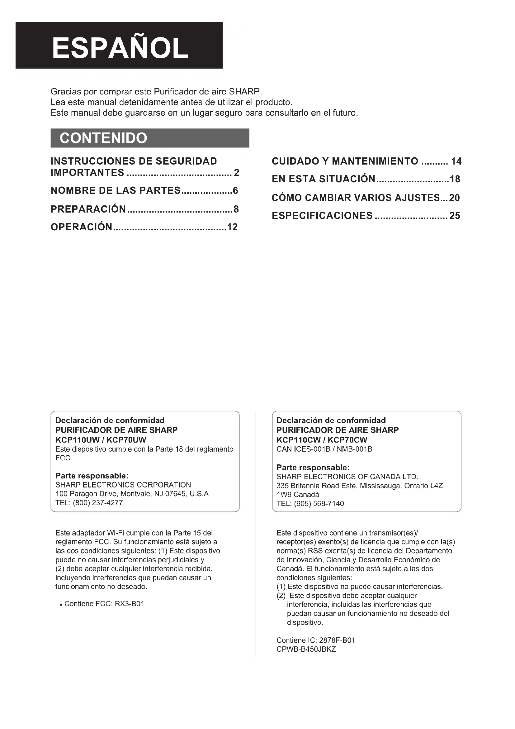 Parte responsable: SHARP ELECTRONICS OF CANADA LTD.335 Britannia Road Este, Mississauga, Ontario L4Z 1W9 CanadáTEL: (905) 568-7140Este dispositivo contiene un transmisor(es)/receptor(es) exento(s) de licencia que cumple con la(s) norma(s) RSS exenta(s) de licencia del Departamento de Innovación, Ciencia y Desarrollo Económico de Canadá. El funcionamiento está sujeto a las dos condiciones siguientes: (1) Este dispositivo no puede causar interferencias. (2) Este dispositivo debe aceptar cualquier interferencia, incluidas las interferencias que puedan causar un funcionamiento no deseado del dispositivo.Contiene IC: 2878F-B01CPWB-B450JBKZ KCP110UW_70UW_110CW_70CW_2nd.indb 64KCP110UW_70UW_110CW_70CW_2nd.indb 64 2022/03/23 11:19:322022/03/23 11:19:32ES-1 ESPAÑOL El purificador de aire absorbe el aire de la entrada de aire y éste pasa a través del pre-filtro, un Filtro desodorizante de carbón activo y un Filtro True HEPA en la parte interna de la unidad, y luego lo descargar a través del orificio de descarga de aire. El Filtro True HEPA puede eliminar el 99,97% de las partículas de polvo de tamaño tan pequeño como 0,3 micrones que atraviesan el filtro y también ayuda a absorber los olores. El filtro desodorizante de carbón activo absorbe gradualmente los olores a medida que atraviesan el filtro. Algunos olores absorbidos por los filtros pueden descomponerse con el paso del tiempo, causando olores adicionales. Dependiendo del ambiente en el que se use el producto, especialmente cuando es usado en ambientes considerablemente más severo que el uso doméstico normal, estos olores pueden volverse más perceptibles antes de lo esperado. Si los olores persisten, debe reemplazar los filtros. Cuando los minerales contenidos en el agua del grifo se adhieren a los filtros y se vuelven blancos y duros, absorben lo olores de la habitación, los cuales pueden causar la emisión de un olor desagradable cuando el filtro humidificador está seco. (Varía dependiendo de la calidad del agua y otros factores ambientales). Si esto ocurre, lleve a cabo el mantenimiento del filtro humidificador. (Página 15) NOTA