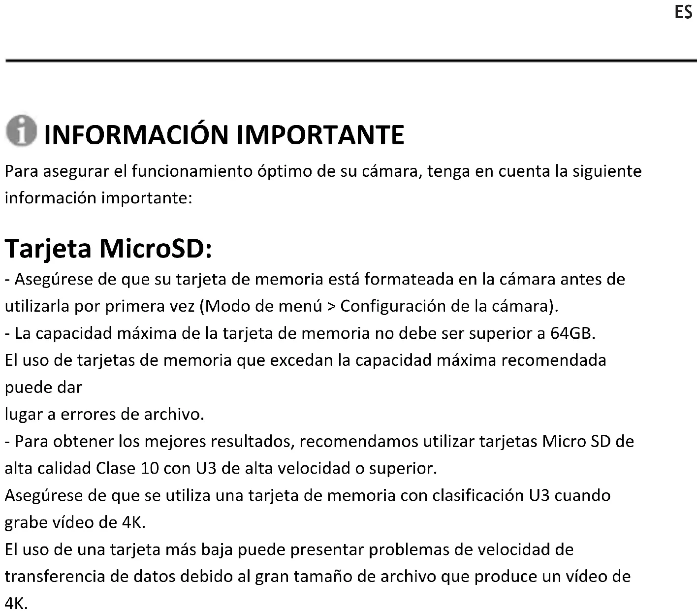 Para asegurar el funcionamiento óptimo de su cámara, tenga en cuenta la siguiente información importante: Tarjeta MicroSD: - Asegúrese de que su tarjeta de memoria está formateada en la cámara antes de utilizarla por primera vez (Modo de menú > Configuración de la cámara). - La capacidad máxima de la tarjeta de memoria no debe ser superior a 64GB. El uso de tarjetas de memoria que excedan la capacidad máxima recomendada puede dar lugar a errores de archivo. - Para obtener los mejores resultados, recomendamos utilizar tarjetas Micro SD de alta calidad Clase 10 con U3 de alta velocidad o superior. Asegúrese de que se utiliza una tarjeta de memoria con clasificación U3 cuando grabe vídeo de 4K. El uso de una tarjeta más baja puede presentar problemas de velocidad de transferencia de datos debido al gran tamaño de archivo que produce un vídeo de 4K.ES