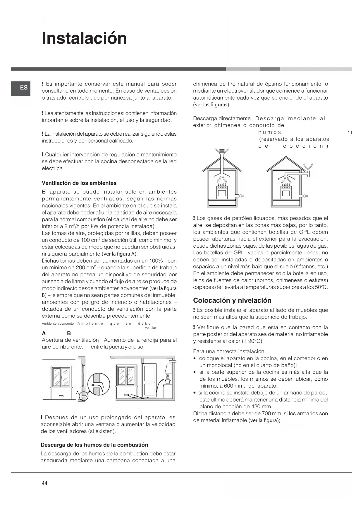! Es importante conservar este manual para poder consultarlo en todo momento. En caso de venta, cesión o traslado, controle que permanezca junto al aparato. ! Lea atentamente las instrucciones: contienen información importante sobre la instalación, el uso y la seguridad. ! La instalación del aparato se debe realizar siguiendo estas instrucciones y por personal calificado. ! Cualquier intervención de regulación o mantenimiento se debe efectuar con la cocina desconectada de la red eléctrica. Ventilación de los ambientes El aparato se puede instalar sólo en ambientes permanentemente ventilados, según las normas nacionales vigentes. En el ambiente en el que se instala el aparato debe poder afluir la cantidad de aire necesaria para la normal combustión (el caudal de aire no debe ser inferior a 2 m