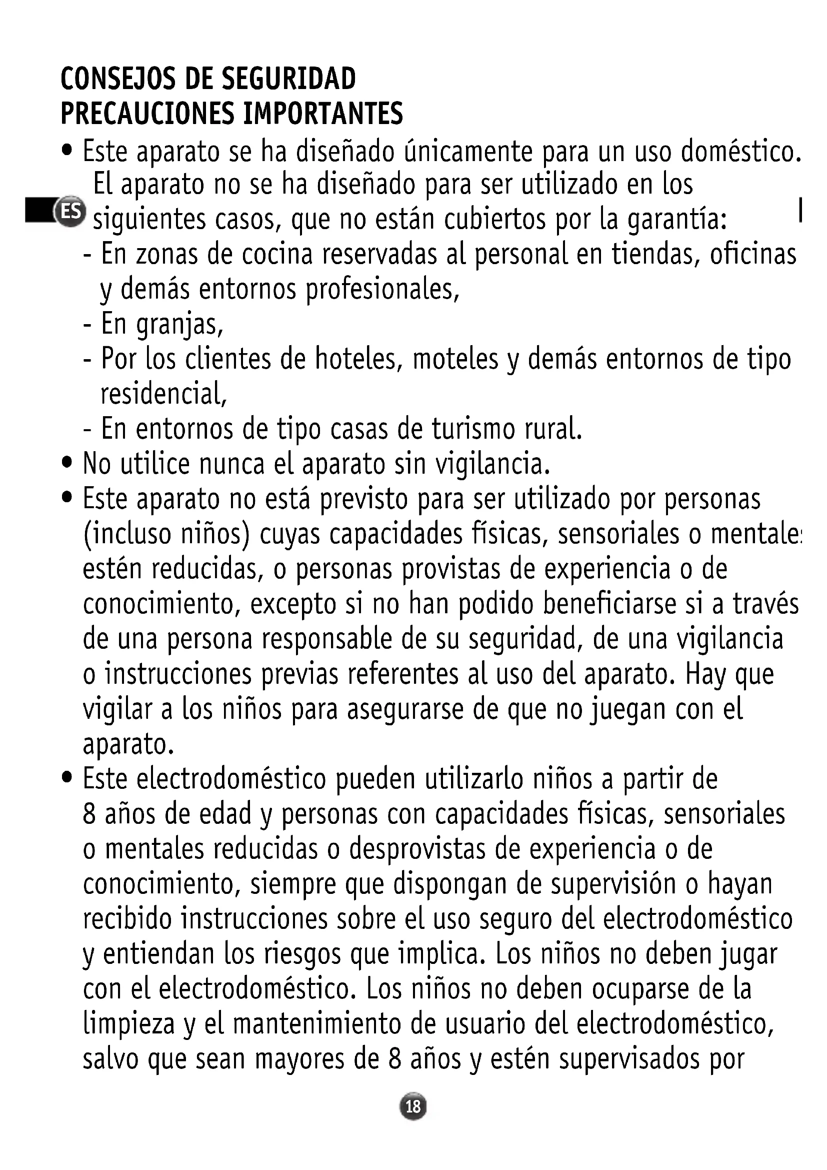 - Este electrodoméstico pueden utilizarlo niños a partir de 8 años de edad y personas con capacidades físicas, sensoriales o mentales reducidas o desprovistas de experiencia o de conocimiento, siempre que dispongan de supervisión o hayan recibido instrucciones sobre el uso seguro del electrodoméstico y entiendan los riesgos que implica. Los niños no deben jugar con el electrodoméstico. Los niños no deben ocuparse de la limpieza y el mantenimiento de usuario del electrodoméstico, salvo que sean mayores de 8 años y estén supervisados por