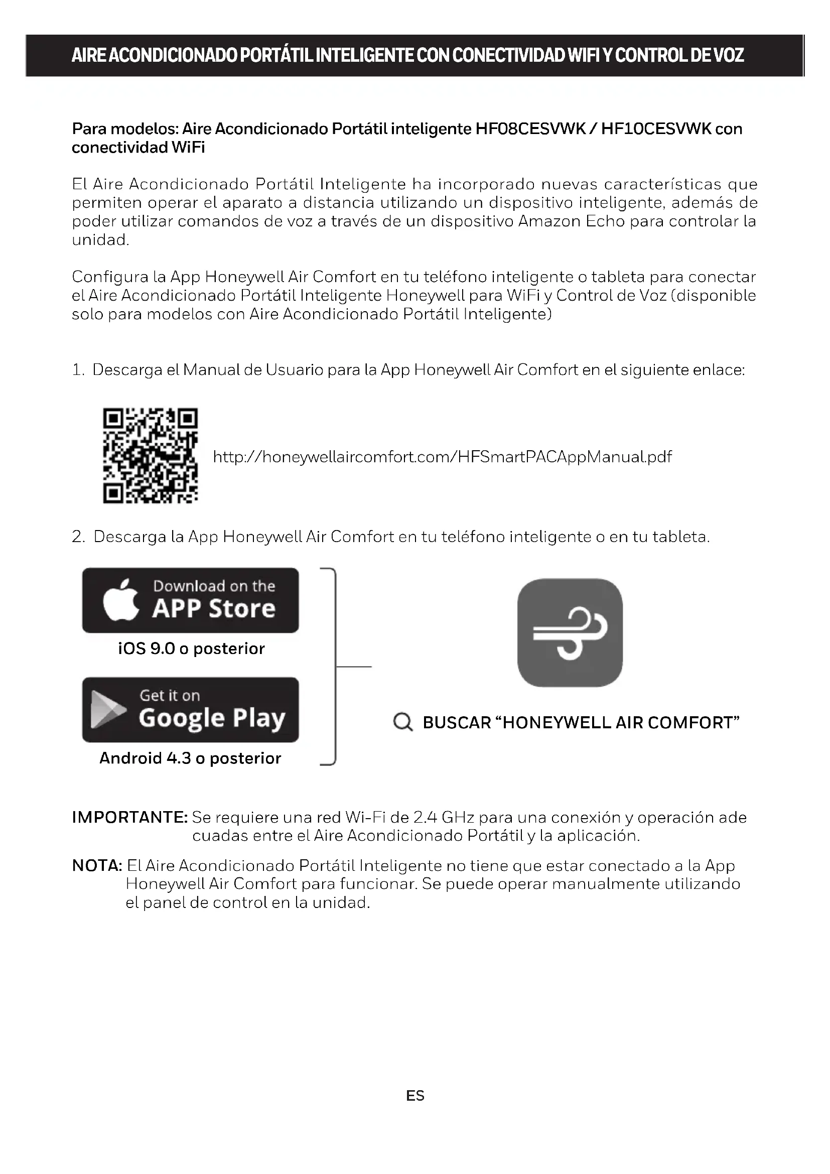 AIRE ACONDICIONADO PORTÁTIL INTELIGENTE CON CONECTIVIDAD WIFI Y CONTROL DE VOZ IMPORTANTE: Se requiere una red Wi-Fi de 2.4 GHz para una conexión y operación ade cuadas entre el Aire Acondicionado Portátil y la aplicación. NOTA: El Aire Acondicionado Portátil Inteligente no tiene que estar conectado a la App Honeywell Air Comfort para funcionar. Se puede operar manualmente utilizando el panel de control en la unidad. http://honeywellaircomfort.com/HFSmartPACAppManual.pdfSEGURIDAD