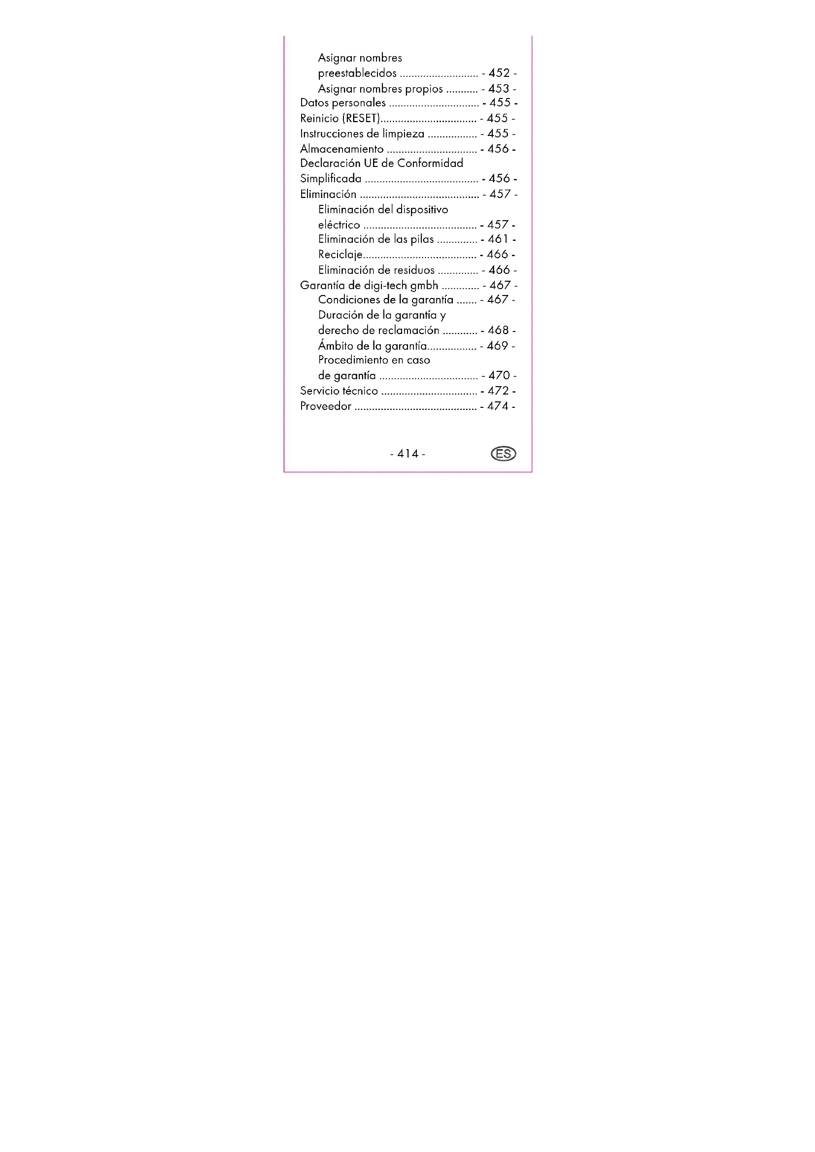 En el caso de pilas viejas que contienen litio (Li = litio) existe un alto riesgo de incendio. Por lo tanto, se debe prestar especial atención a la eliminación adecuada de pilas y acumuladores gastados que contienen litio. La eliminación incorrecta también puede provocar cortocircuitos internos y- 465 - externos debido a efectos térmicos (calor) o daños mecánicos. Un cortocircuito puede provocar fuego o una explosión y tener graves consecuencias para el ser humano y el medio ambiente. Por esta razón, pegue con cinta adhesiva los polos de las baterías y acumuladores que contienen litio antes de desecharlos, para evitar un cortocircuito. Las pilas y los acumuladores que no estén instalados en su aparato de forma permanente, deben retirarse primero y desecharse por separado.- 466 - Entregue las pilas y acumuladores sólo cuando esten descargados! Utilice en lo posible acumuladores (pilas recargables), en lugar de pilas desechables. Reciclaje El embalaje del producto se compone de materiales reciclables. Deséchelos de forma respetuosa al medio ambiente, a través de los sistemas de recolección instalados. Eliminación de residuos Deseche el embalaje respetando al medio ambiente. Observe las indicaciones en los diferentes materiales de embalaje y sepárelos adecuadamente si es necesario.- 467 - Garantía de digi-tech gmbh Con este aparato recibe Ud. una garantía con una validez de 3 años a partir de la fecha de la compra. En caso de defectos de este producto le corresponden a Ud. derechos legalmente reconocidos frente al vendedor. Estos derechos legalmente reconocidos no se ven limitados por la garantía que se expone a continuación. Condiciones de la garantía El período de garantía comienza con la fecha de la compra. Por favor, guarde cuidadosamente y a tal fin el ticket de compra original. Este documento es necesario como prueba de la compra. Si en el transcurso de tres años contados a partir de la fecha de la compra aparecieran en el producto defectos de material o de fabricación, se procederá (a elección de digi-tech-gmbh) a la reparación o sustitución del mismo sin coste alguno para Ud. La prestación de esta garantía se halla supeditada a la presentación, dentro del plazo de 3- 468 - años, del aparato defectuoso, de la prueba de la compra (ticket de compra) y de una corta descripción por escrito del defecto y del momento de su aparición. En caso de que nuestra garantía cubra el defecto, recibirá Ud. el producto reparado o uno nuevo. A la recepción del producto reparado o de su sustituto nuevo no comenzará un nuevo período de garantía. Duración de la garantía y derecho de reclamación La duración de la garantía no se alarga tras la prestación del servicio garantizado, lo que se extiende también a piezas reparadas o sustituidas. Los posibles daños ya existentes en el momento de la compra deberán ser notificados inmediatamente después del desembalaje. Las reparaciones que se tengan que efectuar tras la finalización del período de garantía deberán ser abonadas.- 469 - Ámbito de la garantía El aparato ha sido fabricado cuidadosamente siguiendo pautas de calidad muy estrictas y superando un control de calidad previo a su puesta en venta. Esta garantía se extiende solamente a defectos de material o de fabricación. Esta garantía no se extiende a piezas componentes del instrumento sometidas a un proceso de desgaste normal y que por lo tanto puedan ser consideradas como piezas consumibles, ni sobre desperfectos aparecidos en partes frágiles como por ejemplo, botones, acumuladores o piezas compuestas de cristal. Esta garantía pierde su vigencia si el producto ha sido dañado, utilizado incorrectamente o sometido a operaciones de mantenimiento incorrectas. Para una utilización adecuada del producto deberán observarse estrictamente todas las indicaciones contenidas en el manual de instrucciones. Deben evitarse necesariamente usos y manejos- 470 - desaconsejados en el manual de instrucciones o de los cuales se haya advertido en el mismo. El producto está indicado únicamente para su utilización a título particular y no para un uso comercial o industrial. La garantía pierde su vigencia en caso de un mal o incorrecto uso del mismo, su utilización de forma violenta o en caso de operaciones técnicas no efectuadas por alguno de nuestros servicios técnicos autorizados. Procedimiento en caso de garantía Para garantizar un procedimiento rápido de su solicitud, siga por favor las siguientes instrucciones: