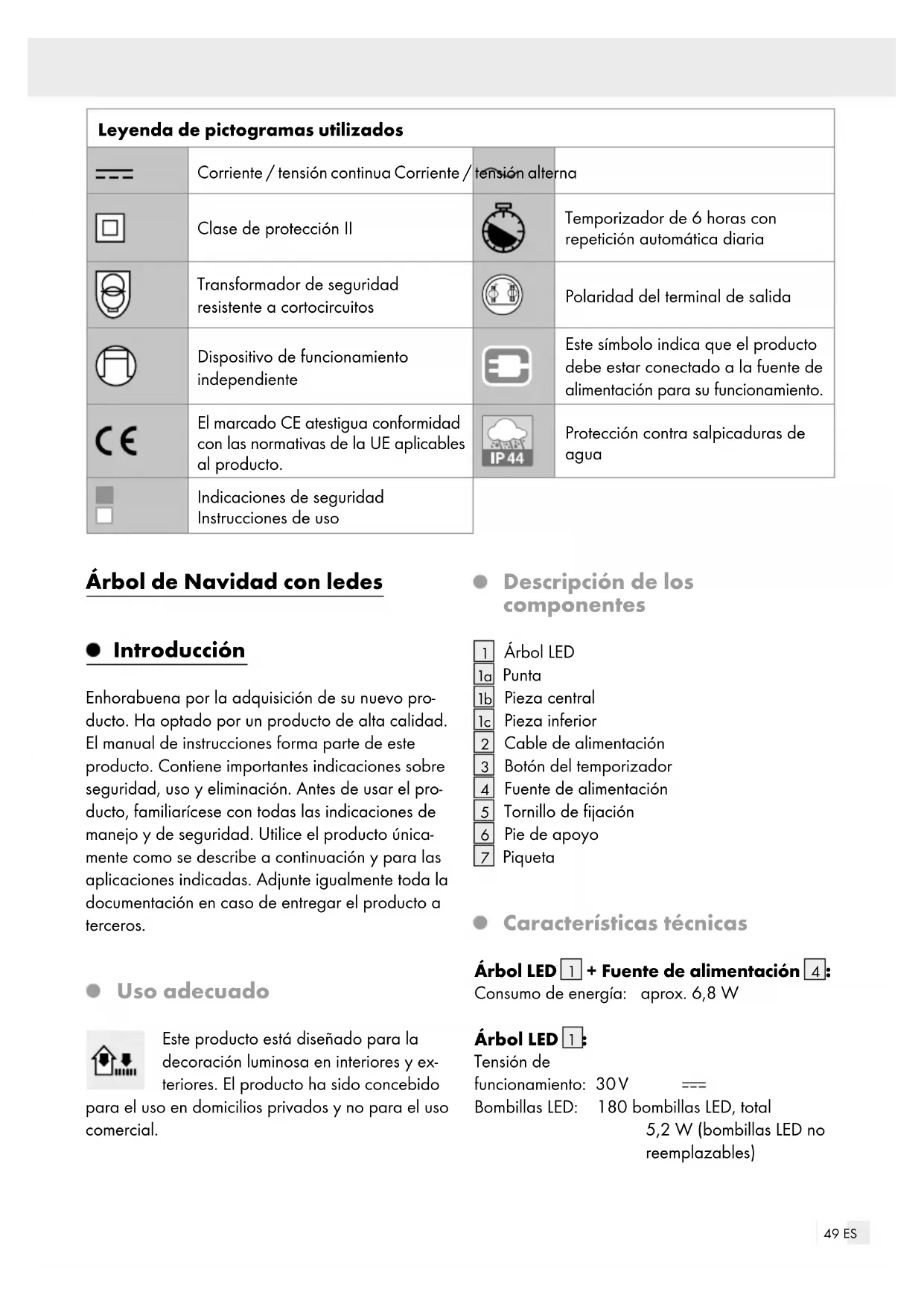 50/60Hz Tensión de funcionamiento secundaria: 30 V , 7,2 W Clase de protección: Tipo de protección: IP44 (protección contra salpicaduras de agua) Fuente de alimentación (n:º de modelo GP-SW300DC0240T-IP44(EU)) certificada por GS. SELV: Tensión baja de segu- ridad (Safety extra low voltage) Ta: Temperatura ambiental máxima Tc: Temperatura de la carcasa en el punto determinado Volumen de suministro 1 árbol LED (1 punta, 1 pieza central, 1 pieza inferior) 1 pie de apoyo 1 fuente de alimentación 3 tornillos de fijación 2 piquetas 1 manual de instrucciones Advertencias de seguridad
