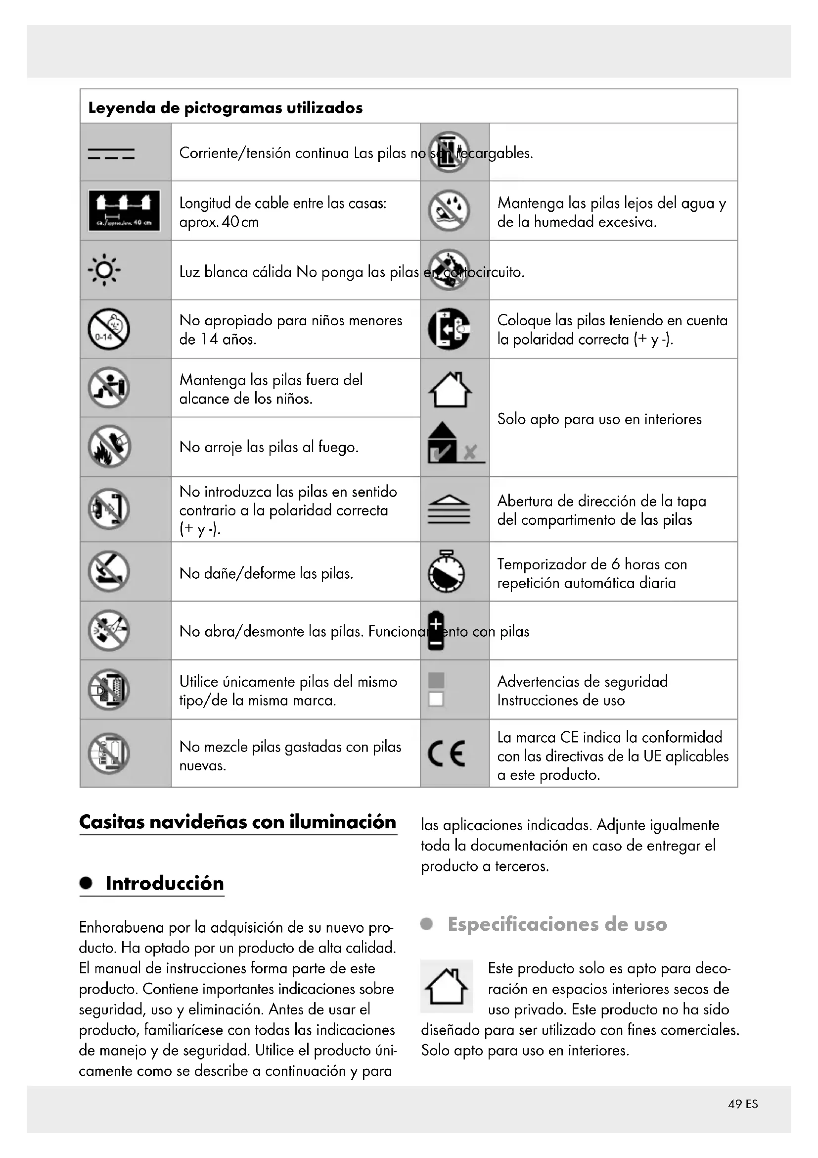 CALENTAMIENTO! No encienda el producto dentro del embalaje. El producto no contiene piezas que requieran mantenimiento por parte del usuario. Las bombillas LED no son reemplazables. Si las bombillas LED llegan al final de su vida útil, deberá reemplazar todo el producto. No debe unir eléctricamente el producto con otra cadena de luces. Nunca conecte el producto a una toma de 230 V. No fije ningún objeto adicional al producto. No lo sujete con grapas ni puntillas. Indicaciones de seguridad para pilas/baterías ¡PELIGRO DE MUERTE! Mantenga las pi- las/ baterías fuera del alcance de los niños. ¡En caso de ingesta, acuda inmediatamente a un médico! La ingesta puede provocar quemaduras, per- foraciones de tejidos blandos y la muerte. Las quemaduras graves pueden aparecer en un plazo de 2 horas tras la ingesta. ¡PELIGRO DE EXPLOSIÓN! No recargue nunca pilas no recarga- bles. No ponga las pilas/baterías en cortocircuito ni tampoco las abra. Estas podrían sobrecalentarse, explotar o provocar un incendio. Nunca arroje pilas/baterías al fuego o al agua. No aplique cargas mecánicas sobre las pilas/ baterías.51 ES Riesgo de sulfatación de las pilas/baterías Evite condiciones y temperaturas extremas que puedan influir en el funcionamiento de las pilas/ baterías, por ej., acercarlas a un radiador/ exponerlas directamente a la luz solar. ¡Si las baterías / pilas se sulfatan, evite el contacto de la piel, los ojos y las mucosas con los productos químicos! ¡En caso de entrar en contacto con el ácido, lave inmediatamente la zona afectada con abundante agua y busque atención médica!
