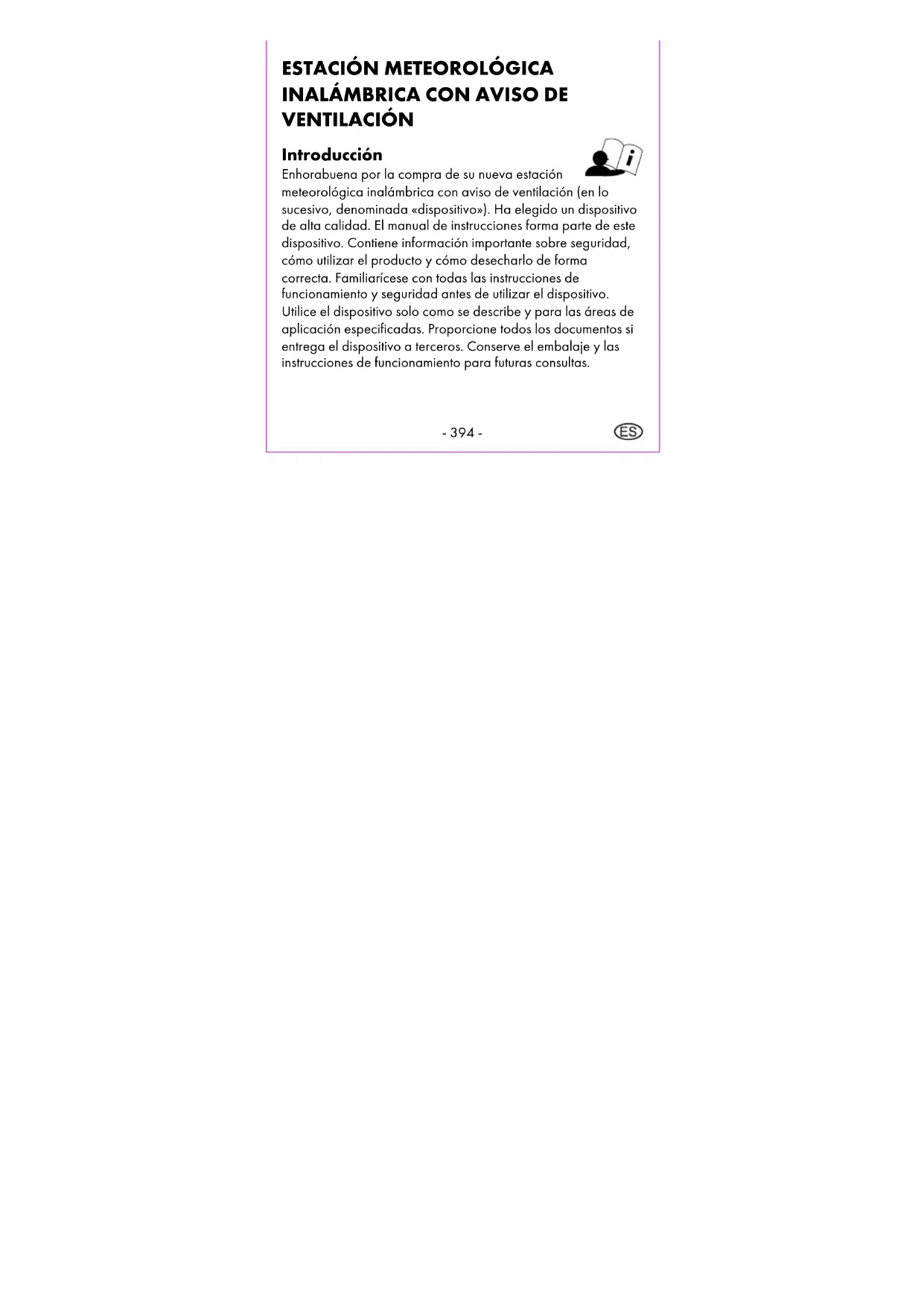 VENTILACIÓN Introducción Enhorabuena por la compra de su nueva estación meteorológica inalámbrica con aviso de ventilación (en lo sucesivo, denominada «dispositivo»). Ha elegido un dispositivo de alta calidad. El manual de instrucciones forma parte de este dispositivo. Contiene información importante sobre seguridad, cómo utilizar el producto y cómo desecharlo de forma correcta. Familiarícese con todas las instrucciones de funcionamiento y seguridad antes de utilizar el dispositivo. Utilice el dispositivo solo como se describe y para las áreas de aplicación especificadas. Proporcione todos los documentos si entrega el dispositivo a terceros. Conserve el embalaje y las instrucciones de funcionamiento para futuras consultas.- 395 - Uso previsto Este dispositivo sirve para mostrar la hora y para utilizar las funciones adicionales descritas. Cualquier otro uso o modificación del dispositivo se considera inadecuado. El fabricante no se responsabiliza de los daños producidos por un uso inadecuado o una manipulación incorrecta. El dispositivo no está destinado a un uso comercial. Contenido Nota: Compruebe el contenido de la entrega después de la compra. Asegúrese de que estén todas las piezas y de que estas no tengan defectos. Si la entrega está incompleta o hay piezas dañadas, no utilice el dispositivo. Póngase en contacto con el servicio de asistencia técnica (véase «Tramitación de la garantía»).