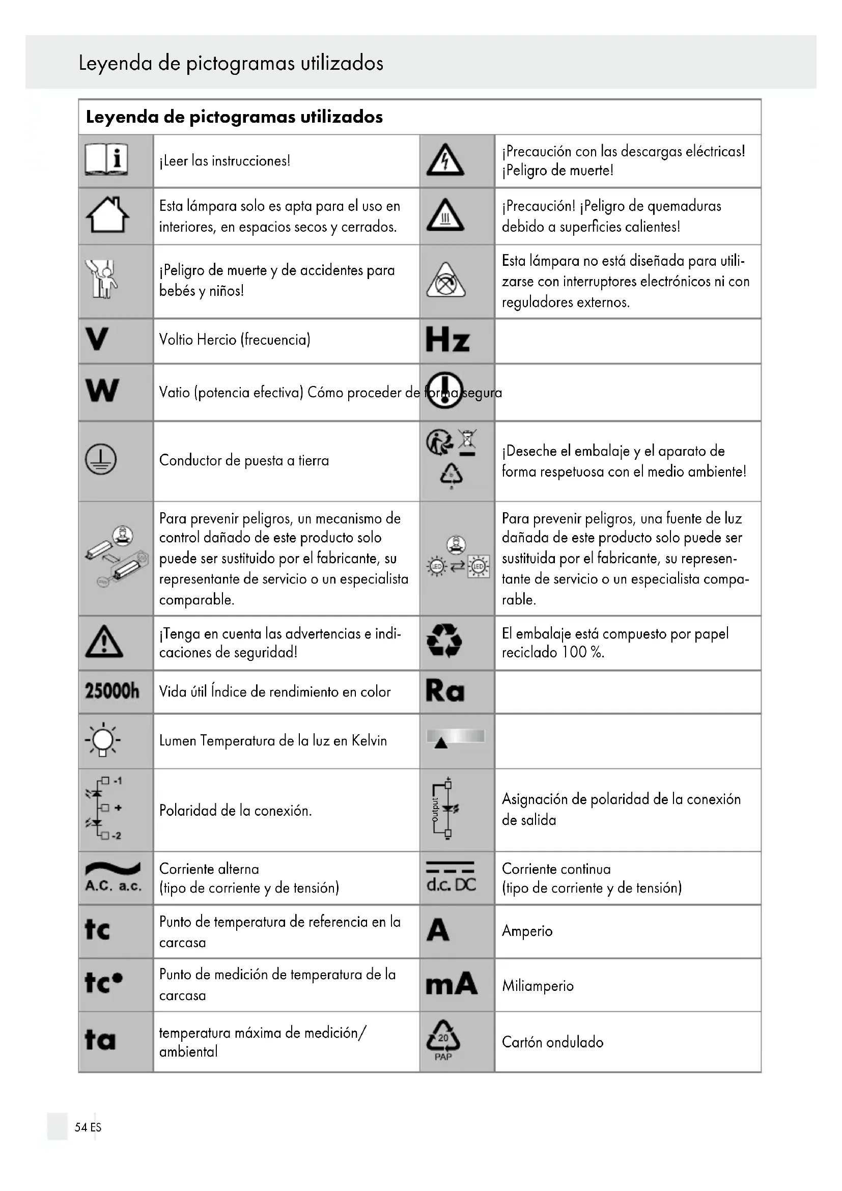 Garantía.........................................................................................................................................Página 58 Dirección del servicio técnico...................................................................................................... Página 58 Declaración de conformidad.......................................................................................................Página 58 Fabricante...................................................................................................................................... Página 58 Índice ES 53Leyenda de pictogramas utilizados ¡Leer las instrucciones! ¡Precaución con las descargas eléctricas! ¡Peligro de muerte! Esta lámpara solo es apta para el uso en interiores, en espacios secos y cerrados. ¡Precaución! ¡Peligro de quemaduras debido a superficies calientes! ¡Peligro de muerte y de accidentes para bebés y niños! Esta lámpara no está diseñada para utili zarse con interruptores electrónicos ni con reguladores externos. Voltio Hercio (frecuencia) Vatio (potencia efectiva) Cómo proceder de forma segura Conductor de puesta a tierra ¡Deseche el embalaje y el aparato de forma respetuosa con el medio ambiente! Para prevenir peligros, un mecanismo de control dañado de este producto solo puede ser sustituido por el fabricante, su representante de servicio o un especialista comparable. Para prevenir peligros, una fuente de luz dañada de este producto solo puede ser sustituida por el fabricante, su represen tante de servicio o un especialista compa rable. ¡Tenga en cuenta las advertencias e indi caciones de seguridad! El embalaje está compuesto por papel reciclado 100 %. Vida útil Índice de rendimiento en color Lumen Temperatura de la luz en Kelvin Polaridad de la conexión. Output Asignación de polaridad de la conexión de salida Corriente alterna (tipo de corriente y de tensión) Corriente continua (tipo de corriente y de tensión) Punto de temperatura de referencia en la carcasa Amperio Punto de medición de temperatura de la carcasa Miliamperio temperatura máxima de medición/ ambiental Cartón ondulado 54 ES Leyenda de pictogramas utilizadosPolietileno (densidad baja) Lámpara led de techo ● Introducción Le damos la enhorabuena por haber adqui rido este nuevo producto. Ha elegido un producto de alta calidad. Lea atenta y completamente las siguientes instrucciones de uso. Despliegue la página con las ilustraciones. Estas instrucciones pertenecen a este producto y contienen indicaciones importantes sobre la puesta en funcionamiento y el manejo. Tenga en cuenta siempre todas las indicaciones de seguridad. Antes de poner el artículo en funcionamiento, compruebe si dispone de la tensión correcta y si todas las piezas están bien montadas. Si tiene dudas o no sabe cómo manejar el aparato, póngase en contacto con su distribuidor o el servicio de asistencia. Conserve estas indicaciones en lugar seguro y, en caso necesario, entrégueselas a terceros. ● Uso adecuado Esta lámpara solo es apta para el uso en interiores, en espacios secos y cerrados. Puede montarse sobre todas las superficies inflamables normales. El producto ha sido diseñado exclusivamente para uso doméstico y no está previsto su empleo comercial. Este producto está dise ñado para un funcionamiento normal. ● Volumen de suministro Compruebe siempre inmediatamente después de desembalar el producto la integridad del contenido y el perfecto estado del aparato. 1 Lámpara de techo LED (modelo 14167506L) 3 Tornillos 3 Tacos 2 Tubos de protección 1 Manual de instrucciones de montaje y manejo
