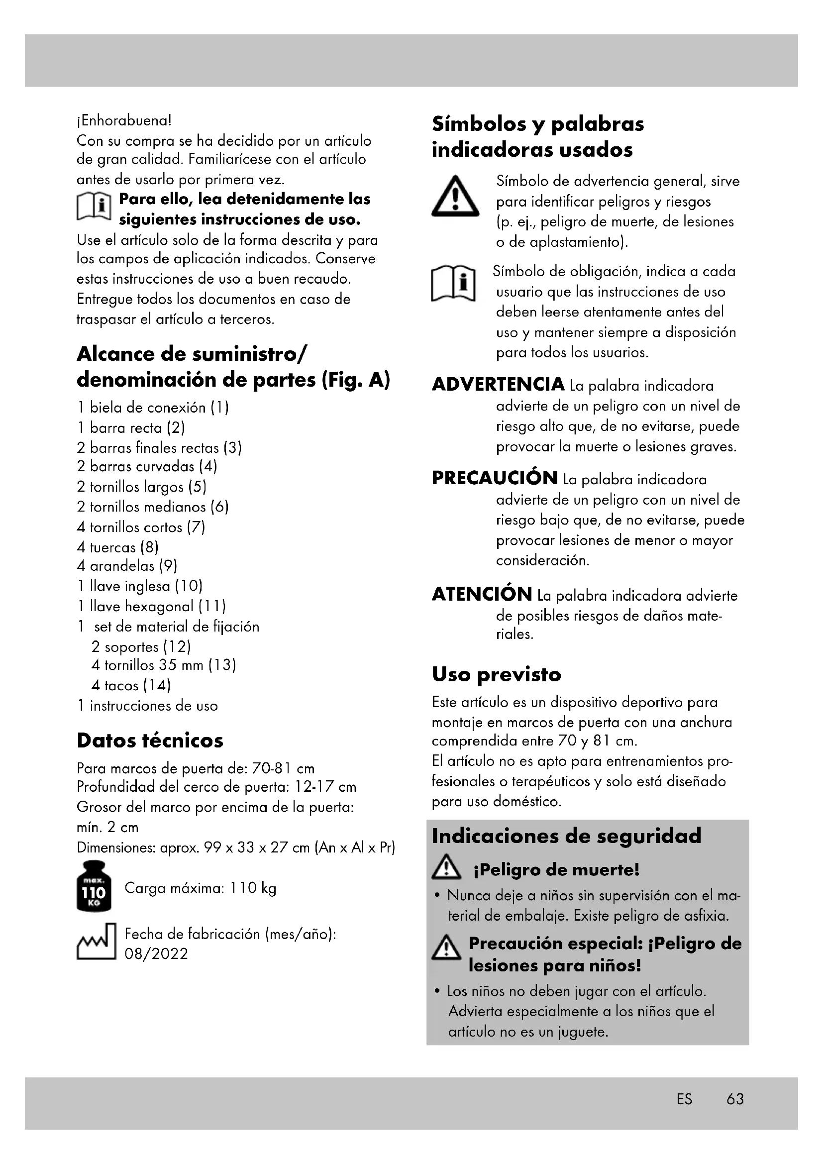 Carga máxima: 110 kg Fecha de fabricación (mes/año): 08/2022 Símbolos y palabras indicadoras usados Símbolo de advertencia general, sirve para identificar peligros y riesgos (p. ej., peligro de muerte, de lesiones o de aplastamiento). Símbolo de obligación, indica a cada usuario que las instrucciones de uso deben leerse atentamente antes del uso y mantener siempre a disposición para todos los usuarios. ADVERTENCIA La palabra indicadora advierte de un peligro con un nivel de riesgo alto que, de no evitarse, puede provocar la muerte o lesiones graves. PRECAUCIÓN La palabra indicadora advierte de un peligro con un nivel de riesgo bajo que, de no evitarse, puede provocar lesiones de menor o mayor consideración. ATENCIÓN La palabra indicadora advierte de posibles riesgos de daños mate- riales. Uso previsto Este artículo es un dispositivo deportivo para montaje en marcos de puerta con una anchura comprendida entre 70 y 81 cm. El artículo no es apto para entrenamientos pro- fesionales o terapéuticos y solo está diseñado para uso doméstico. Indicaciones de seguridad ¡Peligro de muerte!