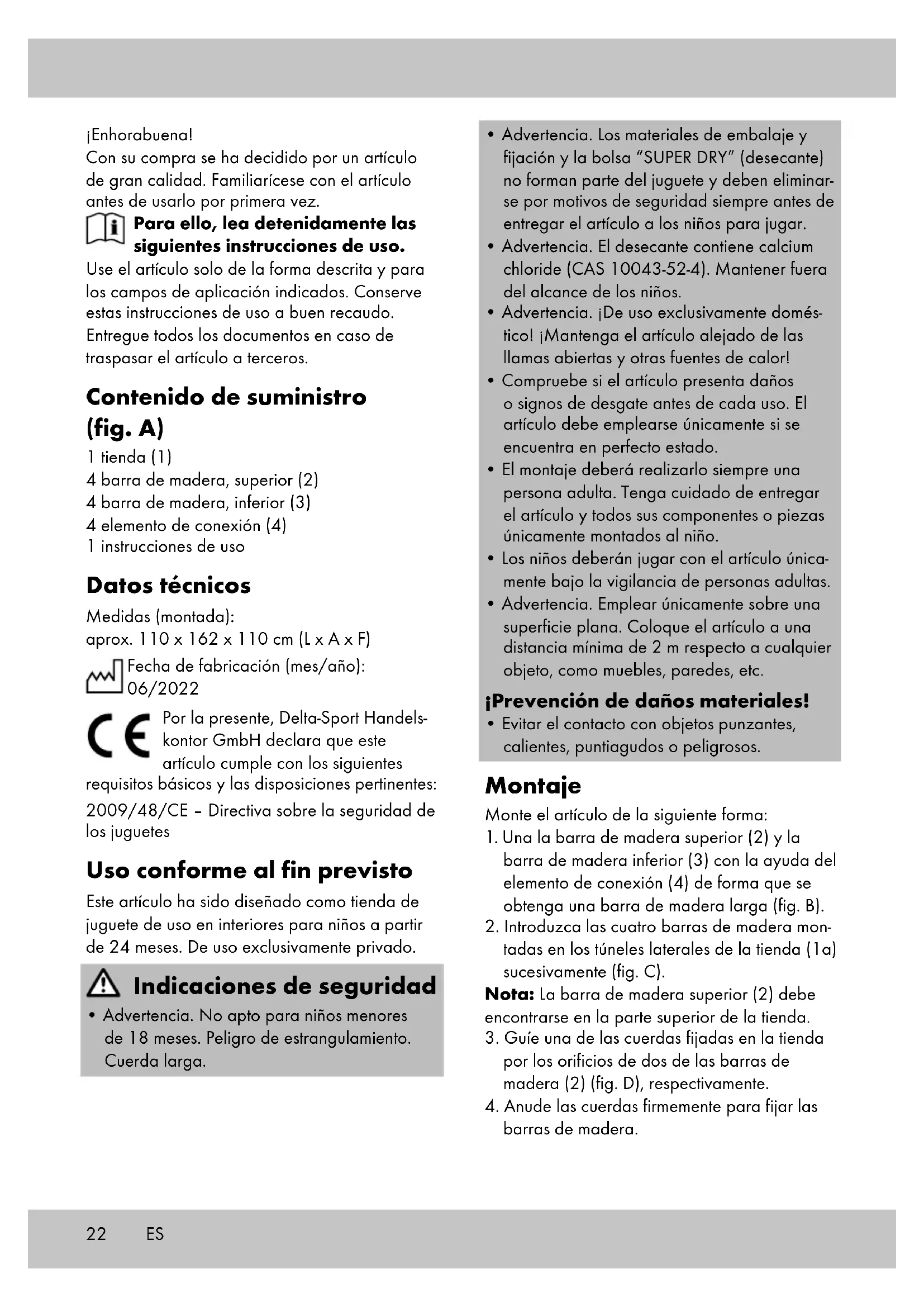 Almacenamiento y limpieza Si no va a utilizarlo, almacene siempre el artícu- lo seco y limpio a temperatura ambiente. ¡IMPORTANTE! No lo limpie con productos de limpieza agresivos. Barras de madera: Límpielas únicamente pasando un paño de limpieza seco. Tienda: Lavar únicamente a mano Indicaciones para la eliminación Elimine el artículo y el material de embalaje conforme a la normativa legal local en la ac- tualidad. No deje material de embalaje, como bolsas de plástico, en manos de niños. Guarde el material de embalaje en un lugar inaccesible para éstos. Deseche los productos y embalajes de manera respetuosa con el medio ambiente. El código de reciclaje sirve para identificar diversos materiales para reincorporarlos en el ciclo de reciclaje. El código consta del símbolo de reciclaje, el cual debe reflejar el ciclo de recuperación, y de un número que identifica el material. Indicaciones relativas a la garantía y la gestión de ser- vicios El artículo ha sido fabricado con gran esmero y sometido a controles constantes. Para el mismo, DELTA-SPORT HANDELSKONTOR GmbH ofrece a los clientes finales particulares una garantía de tres años a contar desde la fecha de compra (periodo de garantía) con arreglo a las condiciones que se exponen a continuación. La garantía tiene validez únicamente para fallos del material y fabricación. La garantía no cubre las piezas sometidas a un desgaste normal, las cuales se consideran piezas de desgaste (p. ej., pilas) así como tampoco piezas frágiles como, p. ej., interruptores, baterías o piezas fabricadas en vidrio o cristal. Se excluyen derechos derivados de esta garantía, si se ha realizado un uso incorrecto o abusivo del artículo o que no se encuentre dentro del marco del uso o ámbito de uso previs- tos o si no se ha observado lo recogido en el manual de instrucciones, a no ser que el cliente final demuestre que existen fallos del material o fabricación no derivados de una de las circuns- tancias expuestas anteriormente. Las demandas derivadas de la garantía sólo podrán presentarse dentro del periodo de garantía exhibiendo el comprobante de compra original. Le rogamos, por ello, que conserve el comprobante de compra original. El periodo de garantía no se verá prolongado por ningún tipo de reparación realizada con motivo de la ga- rantía, la garantía legal o como gesto de buena voluntad. Esto se aplica también a las piezas sustituidas o reparadas. Por favor, dirija sus quejas primero a la línea telefónica del servicio de atención al cliente que se indica a continuación o póngase en contacto con nosotros por correo electrónico. Si el caso está cubierto por la garantía, a nuestra elección, repararemos o cambiaremos gratuitamente el artículo o le restituiremos el precio de compra del mismo. De la garantía no se derivan otros derechos.24 ES Esta garantía no limitará sus derechos legales, especialmente los derechos de garantía frente al vendedor correspondiente. IAN: 392417_2201 Servicio España Tel.: 900 984 989 E-Mail: deltasport@lidl.es25 Hjertelig tillykke! Du har valgt at købe et kvalitetsprodukt. Lær produktet at kende, inden du bruger det første gang. Det gør du ved at læse nedenstå- ende brugervejledning omhygge- ligt. Brug kun produktet som beskrevet og til de angivne anvendelsesområder. Opbevar denne brugervejledning et sikkert sted. Udlever også alle dokumenter, hvis produktet videregives til en tredjepart. Leveringsomfang (afb. A) 1 x teltstof (1) 4 x træstang, foroven (2) 4 x træstang, forneden (3) 4 x forbindelseselement (4) 1 x brugervejledning Tekniske data Mål (opstillet): ca. 110 x 162 x 110 cm (B x H x D) Fremstillingsdato (måned/år): 06/2022 Hermed erklærer Delta-Sport Handelskontor GmbH, at denne artikel er i overensstemmelse med følgende grundlæggende krav og de øvrige gældende bestemmelser: 2009/48/EF – legetøjsdirektiv Tilsigtet brug Denne artikel er udviklet til indendørs brug som legetelt til børn over 24 måneder. Kun til privat brug. Sikkerhedsoplysninger