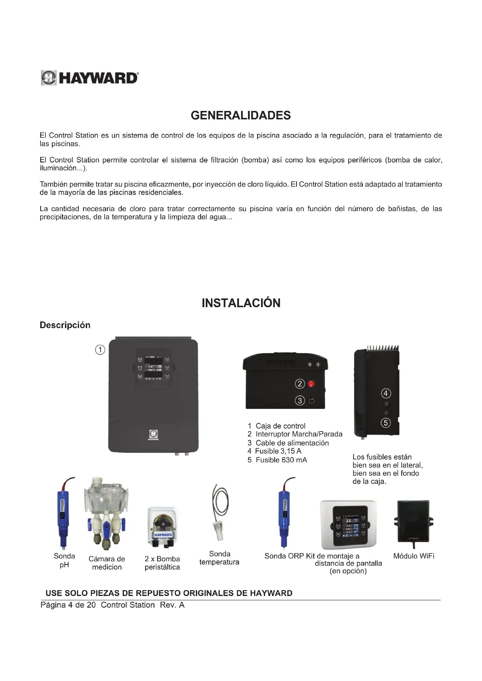 Para su registro Nota REGISTROUSE SOLO PIEZAS DE REPUESTO ORIGINALES DE HAYWARD Página 4 de 20 Control Station Rev. A GENERALIDADES El Control Station es un sistema de control de los equipos de la piscina asociado a la regulación, para el tratamiento de las piscinas. El Control Station permite controlar el sistema de filtración (bomba) así como los equipos periféricos (bomba de calor, iluminación...). También permite tratar su piscina eficazmente, por inyección de cloro líquido. El Control Station está adaptado al tratamiento de la mayoría de las piscinas residenciales. La cantidad necesaria de cloro para tratar correctamente su piscina varía en función del número de bañistas, de las precipitaciones, de la temperatura y la limpieza del agua... INSTALACIÓN Descripción