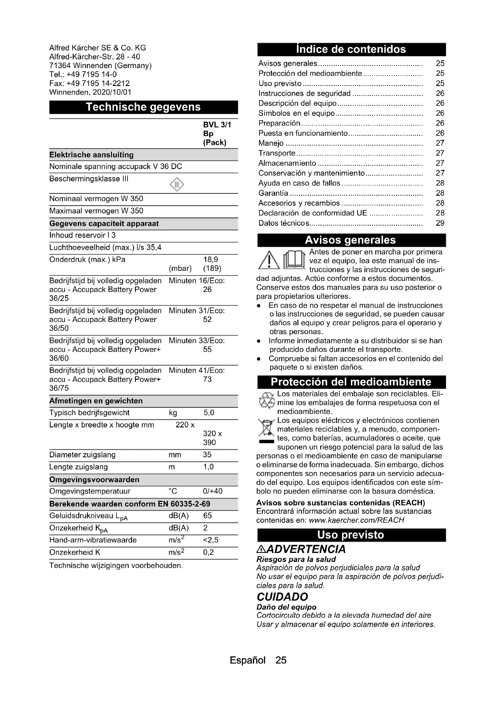 Artikelnum- mer, onver- pakt Accupack Battery Power+ 36/75 2.445-043.0 6.445-059.0 Accupack Battery Power+ 36/60 2.042-022.0 6.445-085.0 Accupack Battery Power 36/50 2.445-031.0 6.445-039.0 Accupack Battery Power 36/25 2.445-030.0 6.445-038.0 Snellader Battery Power+ 36/60 (EU) 2.445-045.0 6.445-063.0 Snellader Battery Power+ 36/60 (GB) 2.445-047.0 6.445-065.0 Snellader Battery Power+ 36/60 (AU) 2.445-051.0 6.445-069.0Español 25 Alfred Kärcher SE & Co. KG Alfred-Kärcher-Str. 28 - 40 71364 Winnenden (Germany) Tel.: +49 7195 14-0 Fax: +49 7195 14-2212 Winnenden, 2020/10/01 Technische gegevens Technische wijzigingen voorbehouden. Índice de contenidos Avisos generales Antes de poner en marcha por primera vez el equipo, lea este manual de ins- trucciones y las instrucciones de seguri- dad adjuntas. Actúe conforme a estos documentos. Conserve estos dos manuales para su uso posterior o para propietarios ulteriores. ● En caso de no respetar el manual de instrucciones o las instrucciones de seguridad, se pueden causar daños al equipo y crear peligros para el operario y otras personas. ● Informe inmediatamente a su distribuidor si se han producido daños durante el transporte. ● Compruebe si faltan accesorios en el contenido del paquete o si existen daños. Protección del medioambiente Los materiales del embalaje son reciclables. Eli- mine los embalajes de forma respetuosa con el medioambiente. Los equipos eléctricos y electrónicos contienen materiales reciclables y, a menudo, componen- tes, como baterías, acumuladores o aceite, que suponen un riesgo potencial para la salud de las personas o el medioambiente en caso de manipularse o eliminarse de forma inadecuada. Sin embargo, dichos componentes son necesarios para un servicio adecua- do del equipo. Los equipos identificados con este sím- bolo no pueden eliminarse con la basura doméstica. Avisos sobre sustancias contenidas (REACH) Encontrará información actual sobre las sustancias contenidas en: www.kaercher.com/REACH Uso previsto 몇 ADVERTENCIA Riesgos para la salud Aspiración de polvos perjudiciales para la salud No usar el equipo para la aspiración de polvos perjudi- ciales para la salud. CUIDADO Daño del equipo Cortocircuito debido a la elevada humedad del aire Usar y almacenar el equipo solamente en interiores. BVL 3/1