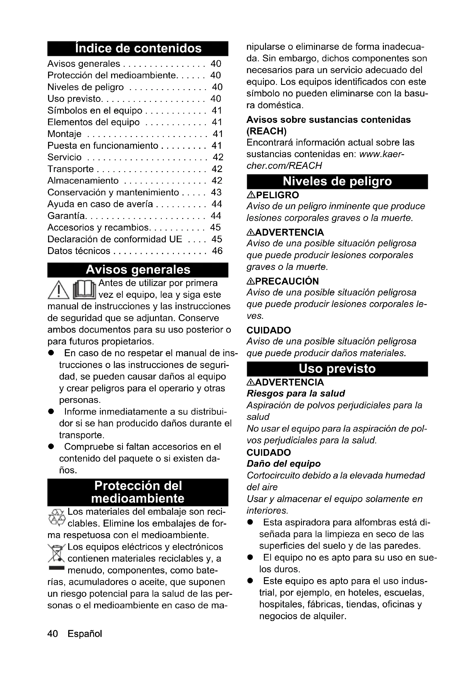 - H05VV-F 2x1,0 H05VV-F 2x1,0 Onderdelennummer (EU/GB) 6.650-913.0 6.650-913.0 Kabellengte m 0,1 0,140 Español Índice de contenidos Avisos generales Antes de utilizar por primera vez el equipo, lea y siga este manual de instrucciones y las instrucciones de seguridad que se adjuntan. Conserve ambos documentos para su uso posterior o para futuros propietarios. En caso de no respetar el manual de ins- trucciones o las instrucciones de seguri- dad, se pueden causar daños al equipo y crear peligros para el operario y otras personas. Informe inmediatamente a su distribui- dor si se han producido daños durante el transporte. Compruebe si faltan accesorios en el contenido del paquete o si existen da- ños. Protección del medioambiente Los materiales del embalaje son reci- clables. Elimine los embalajes de for- ma respetuosa con el medioambiente. Los equipos eléctricos y electrónicos contienen materiales reciclables y, a menudo, componentes, como bate- rías, acumuladores o aceite, que suponen un riesgo potencial para la salud de las per- sonas o el medioambiente en caso de ma- nipularse o eliminarse de forma inadecua- da. Sin embargo, dichos componentes son necesarios para un servicio adecuado del equipo. Los equipos identificados con este símbolo no pueden eliminarse con la basu- ra doméstica. Avisos sobre sustancias contenidas (REACH) Encontrará información actual sobre las sustancias contenidas en: www.kaer- cher.com/REACH Niveles de peligro PELIGRO Aviso de un peligro inminente que produce lesiones corporales graves o la muerte. 몇 ADVERTENCIA Aviso de una posible situación peligrosa que puede producir lesiones corporales graves o la muerte. 몇 PRECAUCIÓN Aviso de una posible situación peligrosa que puede producir lesiones corporales le- ves. CUIDADO Aviso de una posible situación peligrosa que puede producir daños materiales. Uso previsto 몇 ADVERTENCIA Riesgos para la salud Aspiración de polvos perjudiciales para la salud No usar el equipo para la aspiración de pol- vos perjudiciales para la salud. CUIDADO Daño del equipo Cortocircuito debido a la elevada humedad del aire Usar y almacenar el equipo solamente en interiores. Esta aspiradora para alfombras está di- señada para la limpieza en seco de las superficies del suelo y de las paredes. El equipo no es apto para su uso en sue- los duros. Este equipo es apto para el uso indus- trial, por ejemplo, en hoteles, escuelas, hospitales, fábricas, tiendas, oficinas y negocios de alquiler. Avisos generales p. 40