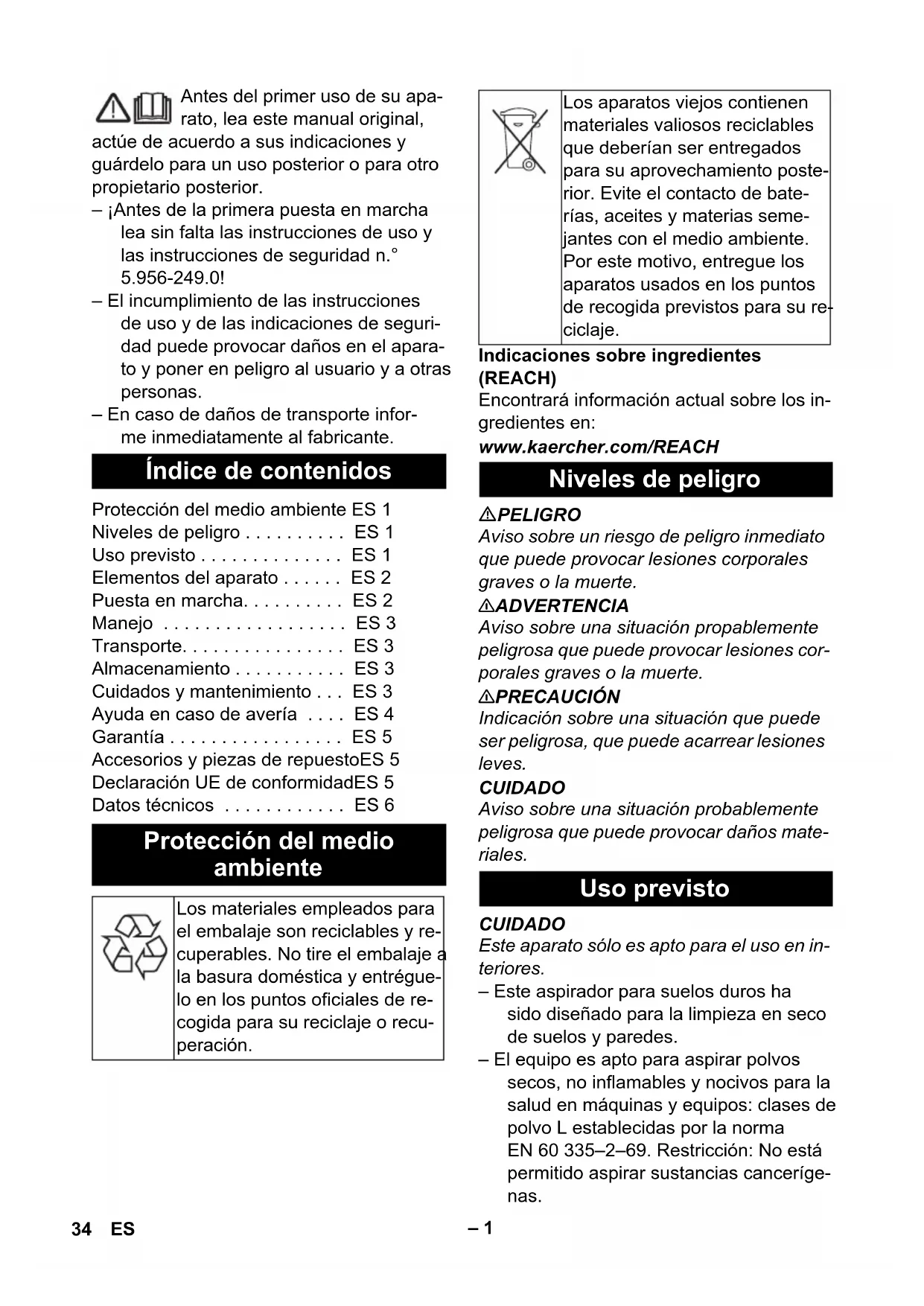 Onderdeelnr. Lengte snoer CH 6.650-837.0 7,5 m 33NL– 1 Antes del primer uso de su apa- rato, lea este manual original, actúe de acuerdo a sus indicaciones y guárdelo para un uso posterior o para otro propietario posterior. – ¡Antes de la primera puesta en marcha lea sin falta las instrucciones de uso y las instrucciones de seguridad n.° 5.956-249.0! – El incumplimiento de las instrucciones de uso y de las indicaciones de seguri- dad puede provocar daños en el apara- to y poner en peligro al usuario y a otras personas. – En caso de daños de transporte infor- me inmediatamente al fabricante. Indicaciones sobre ingredientes (REACH) Encontrará información actual sobre los in- gredientes en: www.kaercher.com/REACH PELIGRO Aviso sobre un riesgo de peligro inmediato que puede provocar lesiones corporales graves o la muerte. 몇 ADVERTENCIA Aviso sobre una situación propablemente peligrosa que puede provocar lesiones cor- porales graves o la muerte. 몇 PRECAUCIÓN Indicación sobre una situación que puede ser peligrosa, que puede acarrear lesiones leves. CUIDADO Aviso sobre una situación probablemente peligrosa que puede provocar daños mate- riales. CUIDADO Este aparato sólo es apto para el uso en in- teriores. – Este aspirador para suelos duros ha sido diseñado para la limpieza en seco de suelos y paredes. – El equipo es apto para aspirar polvos secos, no inflamables y nocivos para la salud en máquinas y equipos: clases de polvo L establecidas por la norma EN 60 335–2–69. Restricción: No está permitido aspirar sustancias canceríge- nas. Índice de contenidos Protección del medio ambiente ES 1 Niveles de peligro . . . . . . . . . . ES 1 Uso previsto . . . . . . . . . . . . . . ES 1 Elementos del aparato . . . . . . ES 2 Puesta en marcha. . . . . . . . . . ES 2 Manejo . . . . . . . . . . . . . . . . . . ES 3 Transporte. . . . . . . . . . . . . . . . ES 3 Almacenamiento . . . . . . . . . . . ES 3 Cuidados y mantenimiento . . . ES 3 Ayuda en caso de avería . . . . ES 4 Garantía . . . . . . . . . . . . . . . . . ES 5 Accesorios y piezas de repuestoES 5 Declaración UE de conformidadES 5 Datos técnicos . . . . . . . . . . . . ES 6 Protección del medio ambiente Los materiales empleados para el embalaje son reciclables y re- cuperables. No tire el embalaje a la basura doméstica y entrégue- lo en los puntos oficiales de re- cogida para su reciclaje o recu- peración. Los aparatos viejos contienen materiales valiosos reciclables que deberían ser entregados para su aprovechamiento poste- rior. Evite el contacto de bate- rías, aceites y materias seme- jantes con el medio ambiente. Por este motivo, entregue los aparatos usados en los puntos de recogida previstos para su re- ciclaje. Niveles de peligro Uso previsto 34 ES– 2 – La boquilla adjunta no es apta para ser usada en alfombras. – Este aparato es apto para el uso indus- trial, p.ej. limpieza de edificios (oficinas, hoteles etc.) para artesanos en obras, carpinteros y en obras en interiores de edificios. 1 Bolsa de filtro de fieltro 2 Tubuladura de aspiración 3 Manguera de aspiración 4 Cinturón de transporte 5 Portamangueras 6 Asa de transporte 7 Orificios de fijación para la correa de transporte 8 Cable de conexión a la red 9 Cabezal de aspiración 10 Bloqueo del cabezal de absorción 11 Recipiente acumulador de suciedad 12 Interruptor principal 13 Boquilla barredora de suelos 14 Tubo de aspiración 15 Soporte para la tubería de absorción 16 Portacables 17 Placa de características 18 Codo 19 Cesta filtrante principal 20 Filtro protector del motor PELIGRO – Cuando se retorne el aire de escape al cuarto, debe existir en el mismo una tasa suficiente de renovación de aire L. Para respetar el valor límite requerido, el flujo volumétrico retornado debe ser como máximo el 50% del flujo volumé- trico de aire exterior limpio (volumen del cuarto V