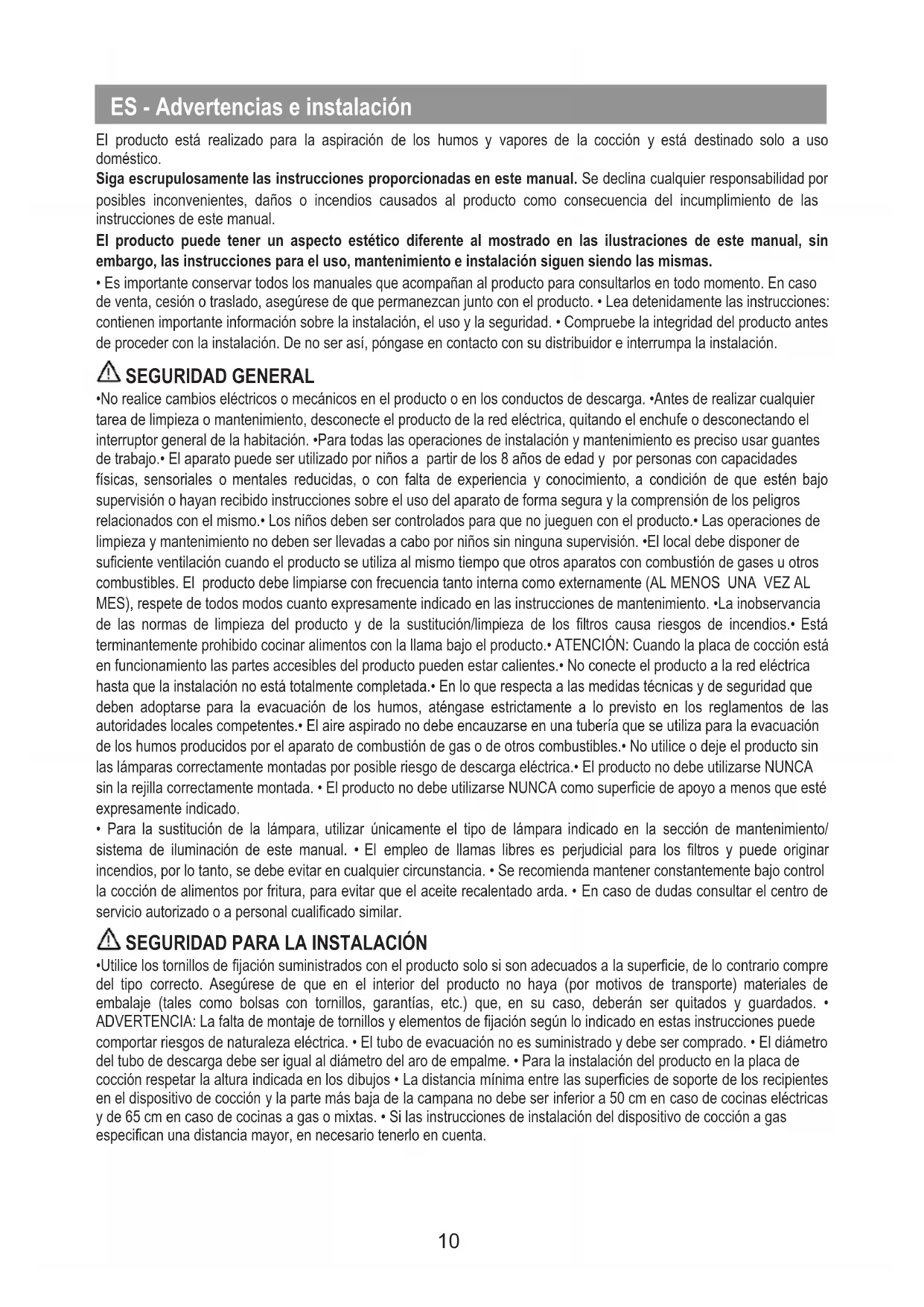 - No realice cambios eléctricos o mecánicos en el producto o en los conductos de descarga. •Antes de realizar cualquier tarea de limpieza o mantenimiento, desconecte el producto de la red eléctrica, quitando el enchufe o desconectando el interruptor general de la habitación. •Para todas las operaciones de instalación y mantenimiento es preciso usar guantes de trabajo.• El aparato puede ser utilizado por niños a partir de los 8 años de edad y por personas con capacidades físicas, sensoriales o mentales reducidas, o con falta de experiencia y conocimiento, a condición de que estén bajo supervisión o hayan recibido instrucciones sobre el uso del aparato de forma segura y la comprensión de los peligros relacionados con el mismo.• Los niños deben ser controlados para que no jueguen con el producto.• Las operaciones de limpieza y mantenimiento no deben ser llevadas a cabo por niños sin ninguna supervisión. •El local debe disponer de suficiente ventilación cuando el producto se utiliza al mismo tiempo que otros aparatos con combustión de gases u otros combustibles. El producto debe limpiarse con frecuencia tanto interna como externamente (AL MENOS UNA VEZ AL MES), respete de todos modos cuanto expresamente indicado en las instrucciones de mantenimiento. •La inobservancia de las normas de limpieza del producto y de la sustitución/limpieza de los filtros causa riesgos de incendios.• Está terminantemente prohibido cocinar alimentos con la llama bajo el producto.• ATENCIÓN: Cuando la placa de cocción está en funcionamiento las partes accesibles del producto pueden estar calientes.• No conecte el producto a la red eléctrica hasta que la instalación no está totalmente completada.• En lo que respecta a las medidas técnicas y de seguridad que deben adoptarse para la evacuación de los humos, aténgase estrictamente a lo previsto en los reglamentos de las autoridades locales competentes.• El aire aspirado no debe encauzarse en una tubería que se utiliza para la evacuación de los humos producidos por el aparato de combustión de gas o de otros combustibles.• No utilice o deje el producto sin las lámparas correctamente montadas por posible riesgo de descarga eléctrica.• El producto no debe utilizarse NUNCA sin la rejilla correctamente montada. • El producto no debe utilizarse NUNCA como superficie de apoyo a menos que esté expresamente indicado.