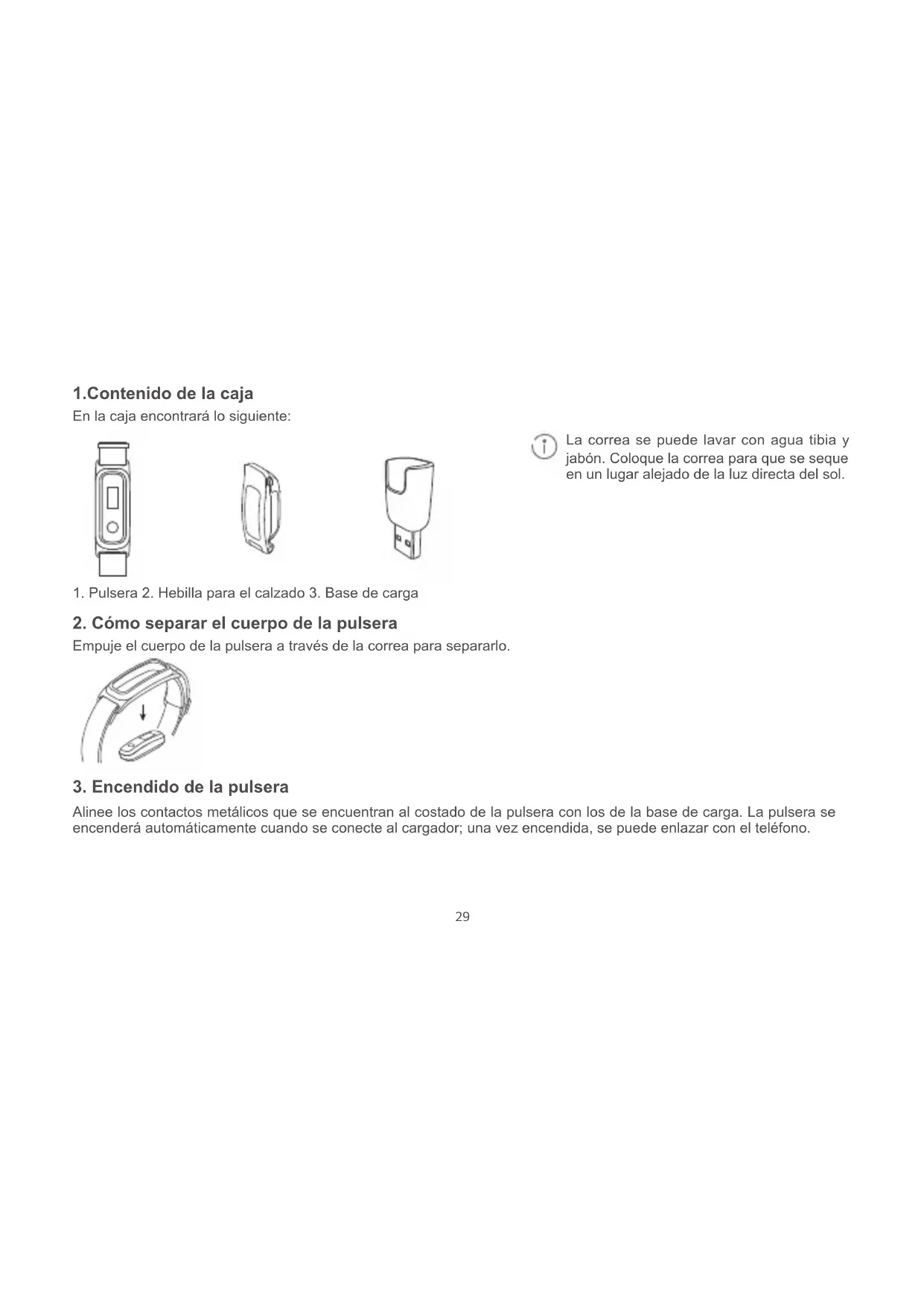 Empuje el cuerpo de la pulsera a través de la correa para separarlo. Alinee los contactos metálicos que se encuentran al costado de la pulsera con los de la base de carga. La pulsera se encenderá automáticamente cuando se conecte al cargador; una vez encendida, se puede enlazar con el teléfono. La correa se puede lavar con agua tibia y jabón. Coloque la correa para que se seque en un lugar alejado de la luz directa del sol.30