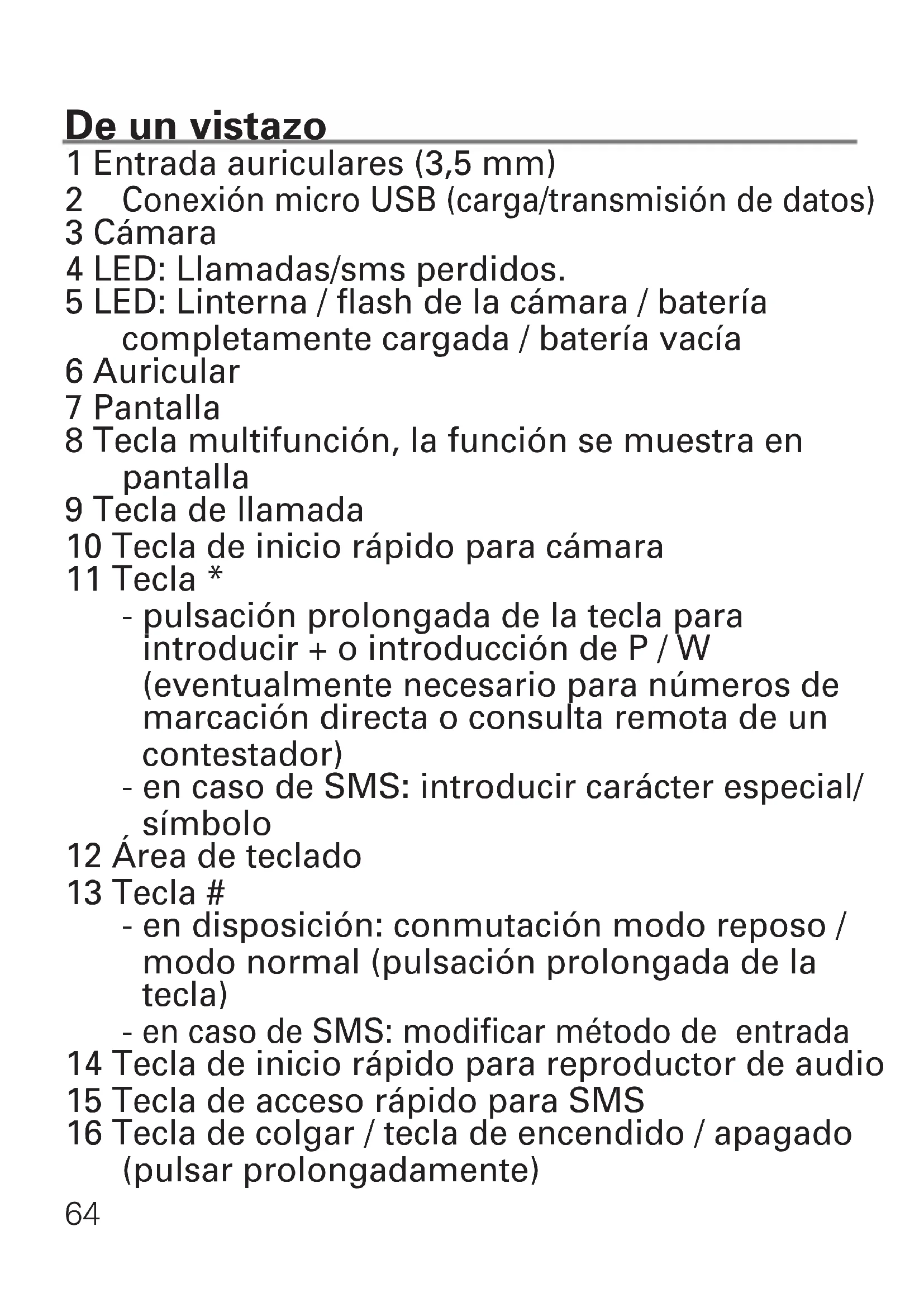 Conexión micro USB (carga/transmisión de datos) 3 Cámara 4 LED: Llamadas/sms perdidos. 5 LED: Linterna / flash de la cámara / batería completamente cargada / batería vacía 6 Auricular 7 Pantalla 8 Tecla multifunción, la función se muestra en pantalla 9 Tecla de llamada 10 Tecla de inicio rápido para cámara 11 Tecla * - pulsación prolongada de la tecla para introducir + o introducción de P / W (eventualmente necesario para números de marcación directa o consulta remota de un contestador) - en caso de SMS: introducir carácter especial/ símbolo 12 Área de teclado 13 Tecla # - en disposición: conmutación modo reposo / modo normal (pulsación prolongada de la tecla)
