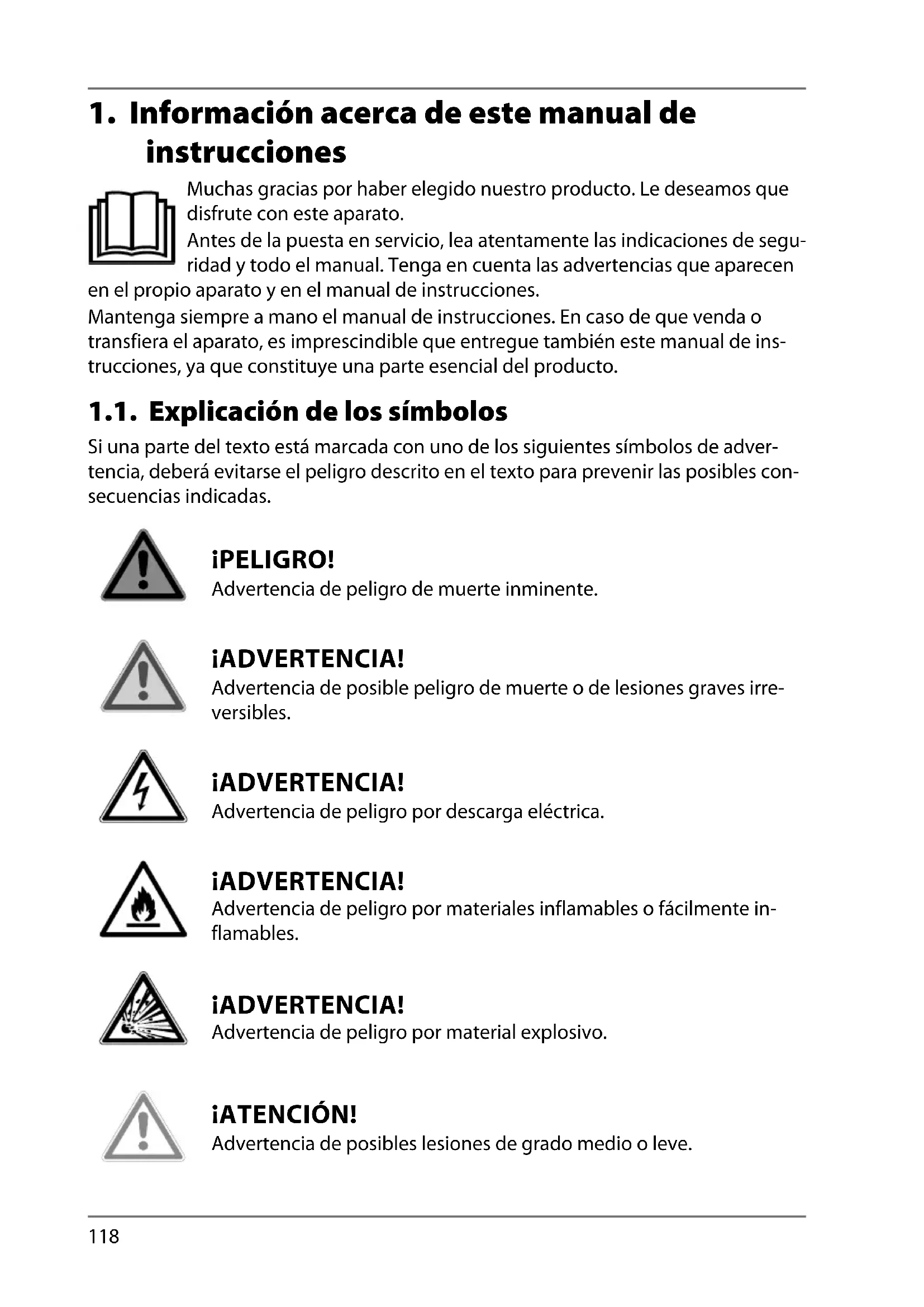 1. Información acerca de este manual de instrucciones ........................... 118