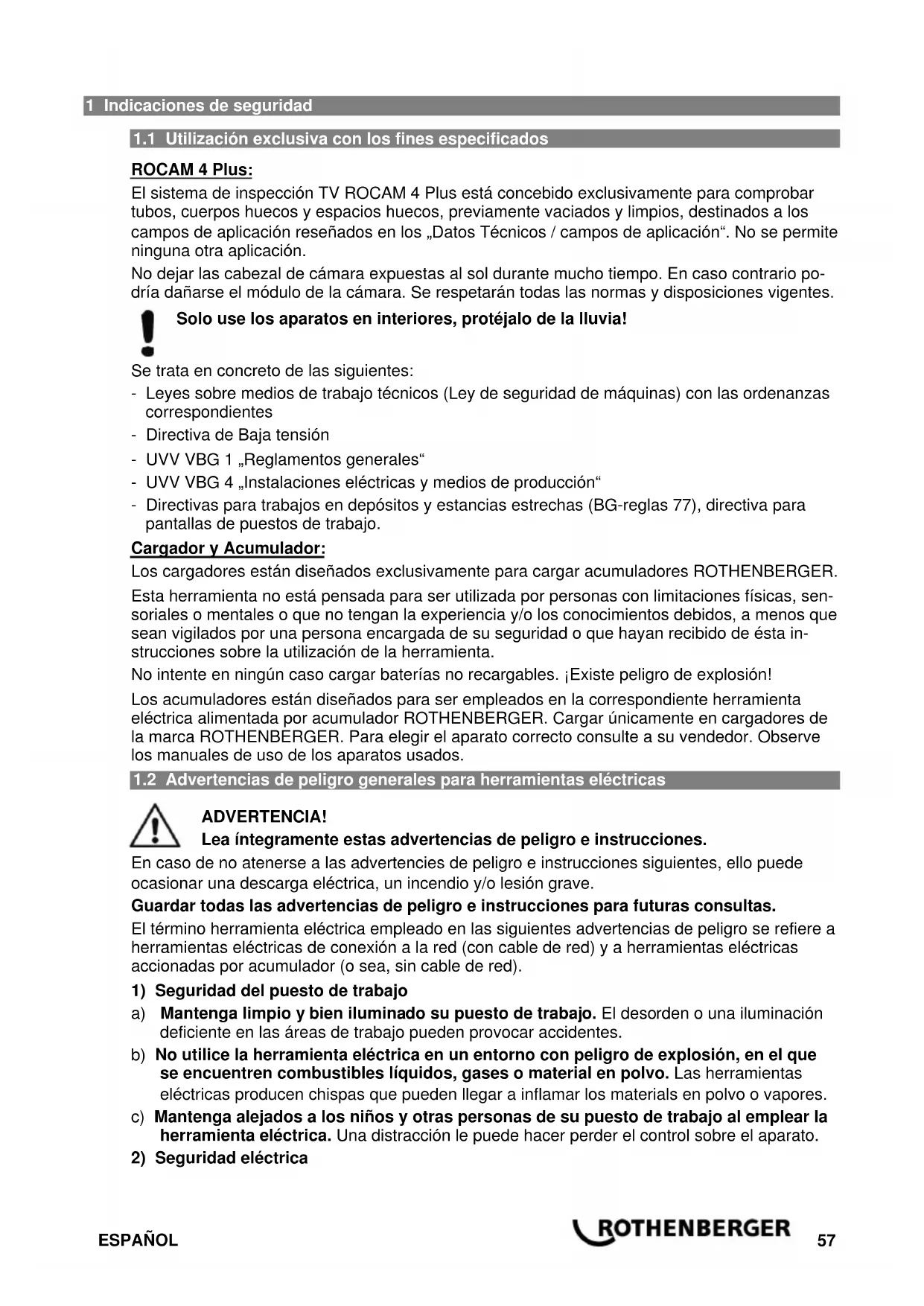ROCAM 4 Plus: El sistema de inspección TV ROCAM 4 Plus está concebido exclusivamente para comprobar tubos, cuerpos huecos y espacios huecos, previamente vaciados y limpios, destinados a los campos de aplicación reseñados en los „Datos Técnicos / campos de aplicación“. No se permite ninguna otra aplicación. No dejar las cabezal de cámara expuestas al sol durante mucho tiempo. En caso contrario po- dría dañarse el módulo de la cámara. Se respetarán todas las normas y disposiciones vigentes. Solo use los aparatos en interiores, protéjalo de la lluvia! Se trata en concreto de las siguientes: - Leyes sobre medios de trabajo técnicos (Ley de seguridad de máquinas) con las ordenanzas correspondientes - Directiva de Baja tensión - UVV VBG 1 „Reglamentos generales“ - UVV VBG 4 „Instalaciones eléctricas y medios de producción“ - Directivas para trabajos en depósitos y estancias estrechas (BG-reglas 77), directiva para pantallas de puestos de trabajo. Cargador y Acumulador: Los cargadores están diseñados exclusivamente para cargar acumuladores ROTHENBERGER. Esta herramienta no está pensada para ser utilizada por personas con limitaciones físicas, sen- soriales o mentales o que no tengan la experiencia y/o los conocimientos debidos, a menos que sean vigilados por una persona encargada de su seguridad o que hayan recibido de ésta in- strucciones sobre la utilización de la herramienta. No intente en ningún caso cargar baterías no recargables. ¡Existe peligro de explosión! Los acumuladores están diseñados para ser empleados en la correspondiente herramienta eléctrica alimentada por acumulador ROTHENBERGER. Cargar únicamente en cargadores de la marca ROTHENBERGER. Para elegir el aparato correcto consulte a su vendedor. Observe los manuales de uso de los aparatos usados.