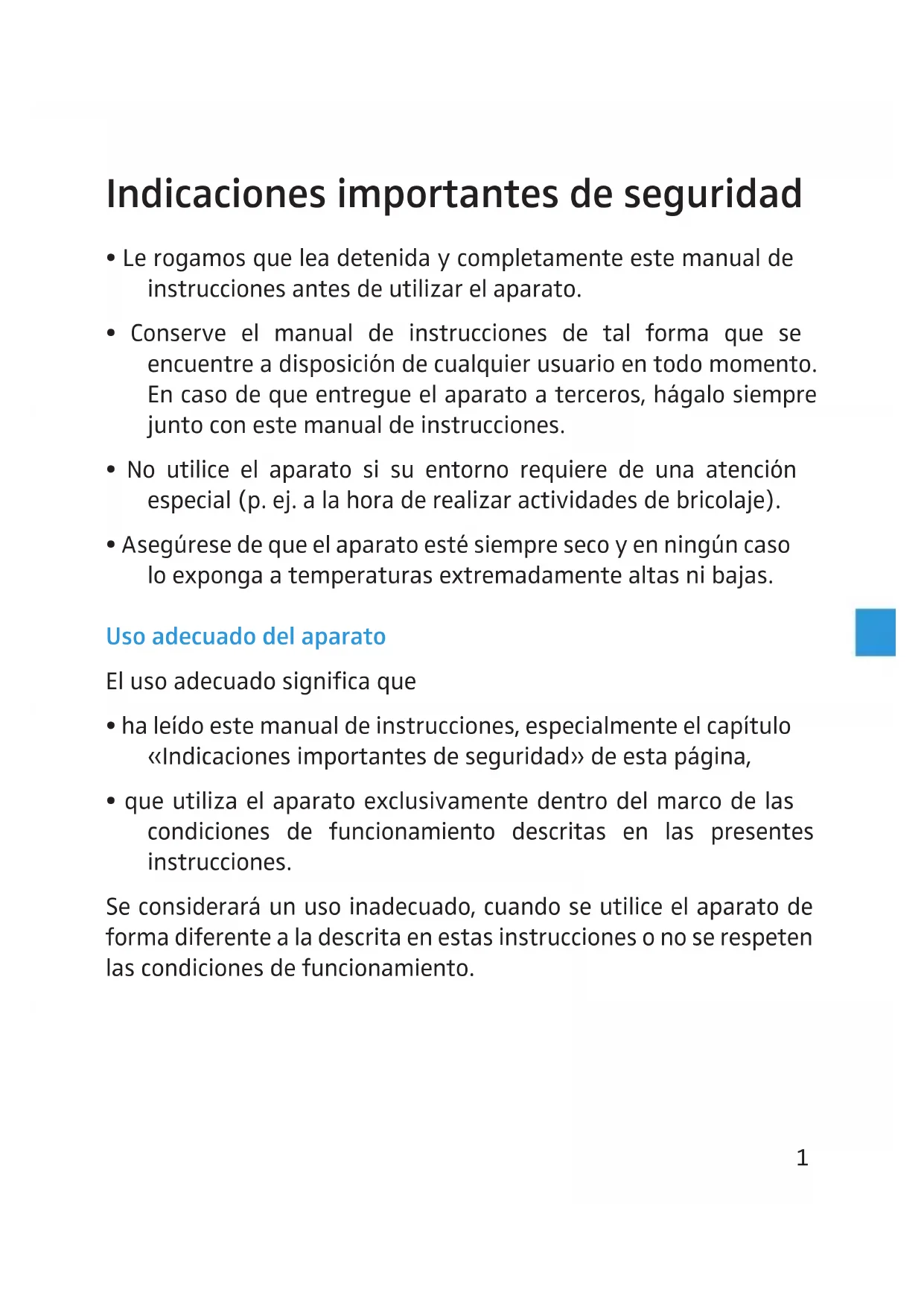 - Conserve el manual de instrucciones de tal forma que se encuentre a disposición de cualquier usuario en todo momento. En caso de que entregue el aparato a terceros, hágalo siempre junto con este manual de instrucciones.