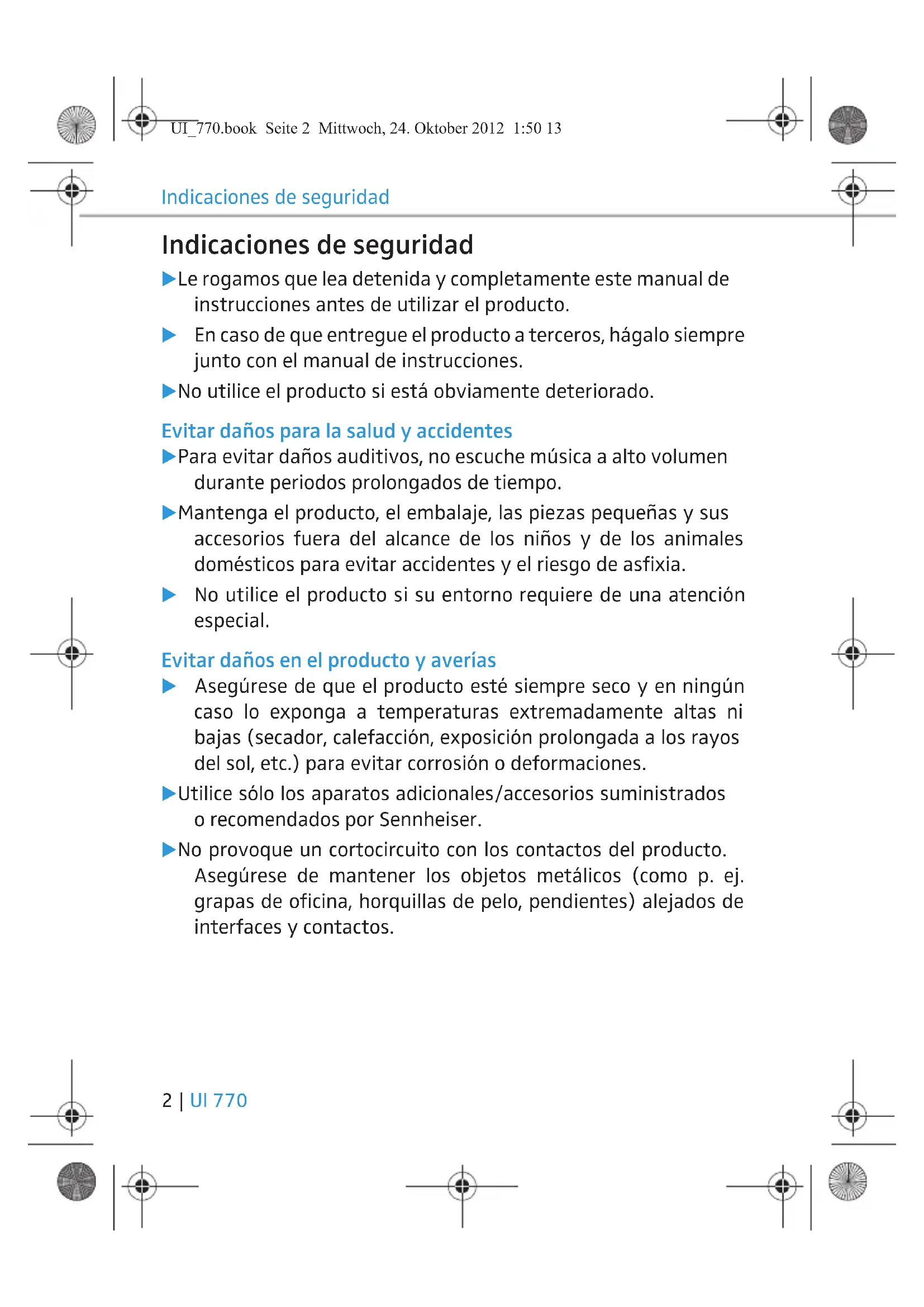 - Declaraciones del fabricante UI_770.book Seite 1 Mittwoch, 24. Oktober 2012 1:50 13Indicaciones de seguridad 2 | UI 770 Indicaciones de seguridad 왘 Le rogamos que lea detenida y completamente este manual de instrucciones antes de utilizar el producto. 왘 En caso de que entregue el producto a terceros, hágalo siempre junto con el manual de instrucciones. 왘 No utilice el producto si está obviamente deteriorado. Evitar daños para la salud y accidentes 왘 Para evitar daños auditivos, no escuche música a alto volumen durante periodos prolongados de tiempo. 왘 Mantenga el producto, el embalaje, las piezas pequeñas y sus accesorios fuera del alcance de los niños y de los animales domésticos para evitar accidentes y el riesgo de asfixia. 왘 No utilice el producto si su entorno requiere de una atención especial. Evitar daños en el producto y averías 왘 Asegúrese de que el producto esté siempre seco y en ningún caso lo exponga a temperaturas extremadamente altas ni bajas (secador, calefacción, exposición prolongada a los rayos del sol, etc.) para evitar corrosión o deformaciones. 왘 Utilice sólo los aparatos adicionales/accesorios suministrados o recomendados por Sennheiser. 왘 No provoque un cortocircuito con los contactos del producto. Asegúrese de mantener los objetos metálicos (como p. ej. grapas de oficina, horquillas de pelo, pendientes) alejados de interfaces y contactos. UI_770.book Seite 2 Mittwoch, 24. Oktober 2012 1:50 13FRESNL DE ENIT Universal Interface UI 770 UI 770 | 3 Uso adecuado/Responsabilidad El Universal Interface se ha creado para telefonear y como entrada y salida de audio en combinación con un ordenador (VoIP) y/o un teléfono para el uso profesional en oficinas o centros de llamadas. Se considerará uso no adecuado el uso de este producto de forma distinta a como se describe en este manual de instrucciones. Sennheiser no asumirá ningún tipo de responsabilidad si se hace un uso no adecuado del producto o de los aparatos adicionales/ accesorios. Sennheiser no se responsabilizará por daños en aparatos USB que no coincidan con las especificaciones USB. Sennheiser no se responsabilizará por interrupciones en la conexión causada por una carga insuficiente de las baterías recar- gables. Universal Interface UI 770 Al UI 770 se pueden conectar los siguientes aparatos periféricos: p. 15