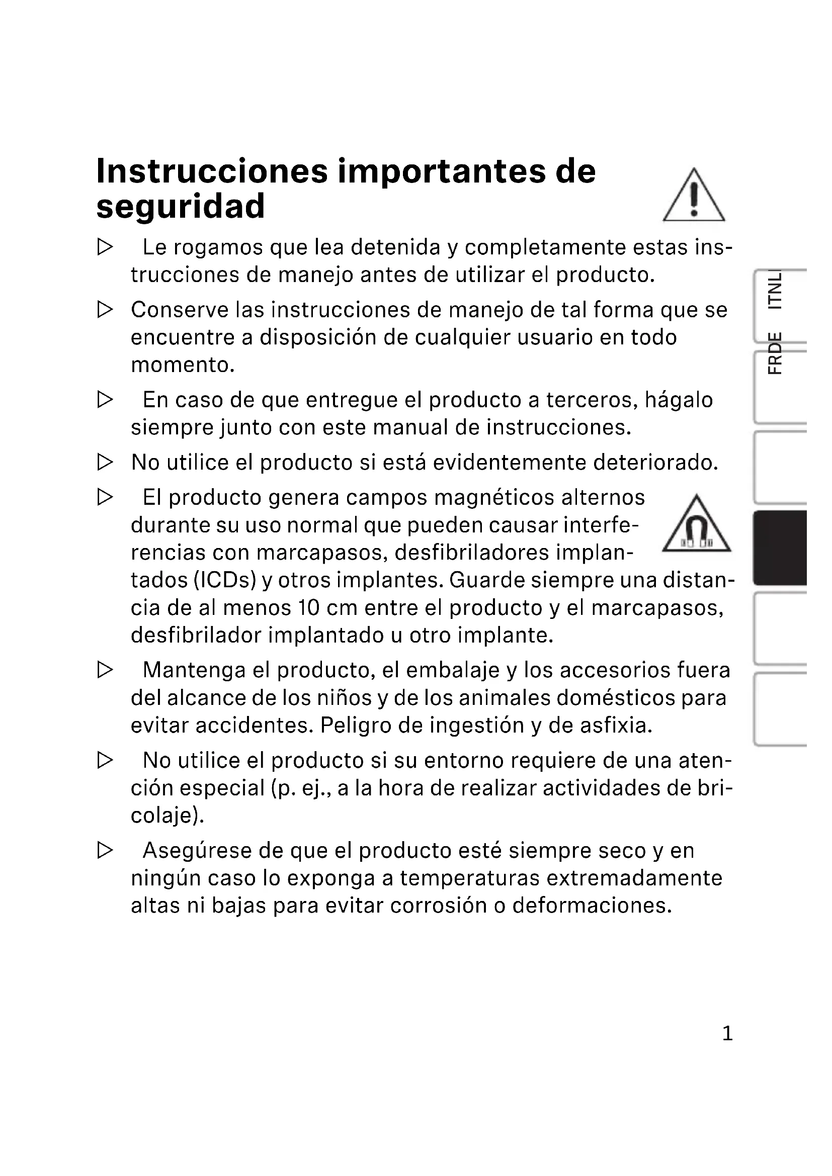 Instrucciones importantes de seguridad ▷ Le rogamos que lea detenida y completamente estas ins- trucciones de manejo antes de utilizar el producto. ▷ Conserve las instrucciones de manejo de tal forma que se encuentre a disposición de cualquier usuario en todo momento. ▷ En caso de que entregue el producto a terceros, hágalo siempre junto con este manual de instrucciones. ▷ No utilice el producto si está evidentemente deteriorado. ▷ El producto genera campos magnéticos alternos durante su uso normal que pueden causar interfe- rencias con marcapasos, desfibriladores implan- tados (ICDs) y otros implantes. Guarde siempre una distan- cia de al menos 10 cm entre el producto y el marcapasos, desfibrilador implantado u otro implante. ▷ Mantenga el producto, el embalaje y los accesorios fuera del alcance de los niños y de los animales domésticos para evitar accidentes. Peligro de ingestión y de asfixia. ▷ No utilice el producto si su entorno requiere de una aten- ción especial (p. ej., a la hora de realizar actividades de bri- colaje). ▷ Asegúrese de que el producto esté siempre seco y en ningún caso lo exponga a temperaturas extremadamente altas ni bajas para evitar corrosión o deformaciones. EZT_3012_532880_0421_SP6.book Seite 1 Mittwoch, 5. Mai 2021 6:46 062 Uso adecuado/responsabilidad El bucle de inducción EZT 3012 es un accesorio para los recep- tores de infrarrojos e inalámbricos de Sennheiser, así como para los puestos de comunicación de sistemas de conferencia. Se encarga de transmitir por inducción la señal de sonido suministrada a su audífono. Se considera uso no adecuado el uso de este producto distinto al descrito en las instrucciones del producto correspondien- tes. Sennheiser no asume ninguna responsabilidad en caso de uso incorrecto o inadecuado del producto o de los dispositivos adi- cionales/accesorios. Antes de la puesta en servicio, se deben observar las disposi- ciones específicas del país de uso. Volumen de suministro 1 bucle de inducción EZT 3012 1 instrucciones de manejo EZT_3012_532880_0421_SP6.book Seite 2 Mittwoch, 5. Mai 2021 6:46 063