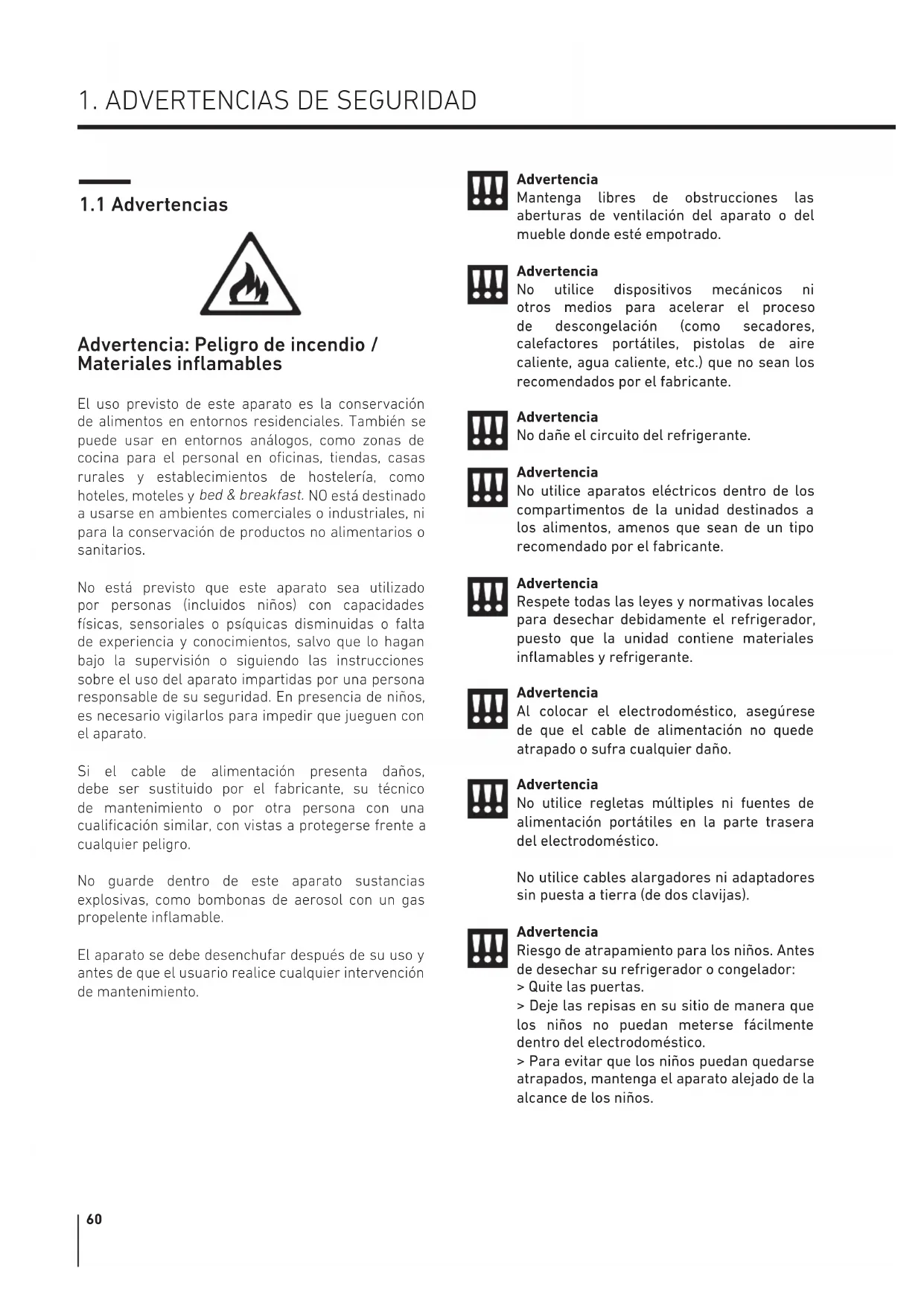 Advertencia: Peligro de incendio / Materiales inflamables El uso previsto de este aparato es la conservación de alimentos en entornos residenciales. También se puede usar en entornos análogos, como zonas de cocina para el personal en oficinas, tiendas, casas rurales y establecimientos de hostelería, como hoteles, moteles y bed & breakfast. NO está destinado a usarse en ambientes comerciales o industriales, ni para la conservación de productos no alimentarios o sanitarios. No está previsto que este aparato sea utilizado por personas (incluidos niños) con capacidades físicas, sensoriales o psíquicas disminuidas o falta de experiencia y conocimientos, salvo que lo hagan bajo la supervisión o siguiendo las instrucciones sobre el uso del aparato impartidas por una persona responsable de su seguridad. En presencia de niños, es necesario vigilarlos para impedir que jueguen con el aparato. Si el cable de alimentación presenta daños, debe ser sustituido por el fabricante, su técnico de mantenimiento o por otra persona con una cualificación similar, con vistas a protegerse frente a cualquier peligro. No guarde dentro de este aparato sustancias explosivas, como bombonas de aerosol con un gas propelente inflamable. El aparato se debe desenchufar después de su uso y antes de que el usuario realice cualquier intervención de mantenimiento. Advertencia Mantenga libres de obstrucciones las aberturas de ventilación del aparato o del mueble donde esté empotrado. Advertencia No utilice dispositivos mecánicos ni otros medios para acelerar el proceso de descongelación (como secadores, calefactores portátiles, pistolas de aire caliente, agua caliente, etc.) que no sean los recomendados por el fabricante. Advertencia No dañe el circuito del refrigerante. Advertencia No utilice aparatos eléctricos dentro de los compartimentos de la unidad destinados a los alimentos, amenos que sean de un tipo recomendado por el fabricante. Advertencia Respete todas las leyes y normativas locales para desechar debidamente el refrigerador, puesto que la unidad contiene materiales inflamables y refrigerante. Advertencia Al colocar el electrodoméstico, asegúrese de que el cable de alimentación no quede atrapado o sufra cualquier daño. Advertencia No utilice regletas múltiples ni fuentes de alimentación portátiles en la parte trasera del electrodoméstico. No utilice cables alargadores ni adaptadores sin puesta a tierra (de dos clavijas). Advertencia Riesgo de atrapamiento para los niños. Antes de desechar su refrigerador o congelador: > Quite las puertas. > Deje las repisas en su sitio de manera que los niños no puedan meterse fácilmente dentro del electrodoméstico. > Para evitar que los niños puedan quedarse atrapados, mantenga el aparato alejado de la alcance de los niños.61