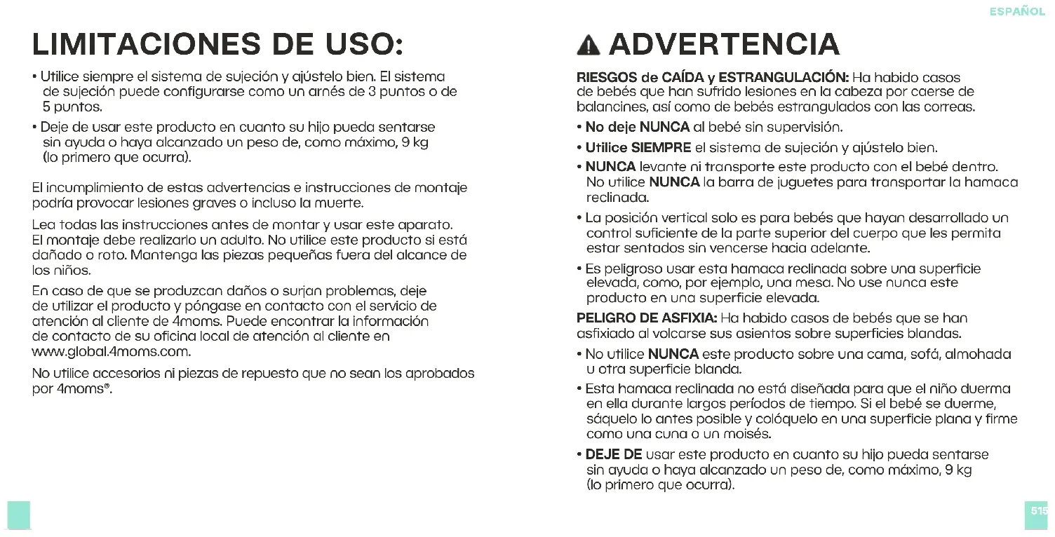 - Deje de usar este producto en cuanto su hijo pueda sentarse sin ayuda o haya alcanzado un peso de, como máximo, 9kg (loprimero que ocurra). El incumplimiento de estas advertencias e instrucciones de montaje podría provocar lesiones graves o incluso la muerte. Lea todas las instrucciones antes de montar y usar este aparato. Elmontaje debe realizarlo un adulto. No utilice este producto si está dañado o roto. Mantenga las piezas pequeñas fuera del alcance de los niños. En caso de que se produzcan daños o surjan problemas, deje de utilizar el producto y póngase en contacto con el servicio de atención al cliente de 4moms. Puede encontrar la información de contacto de su oficina local de atención al cliente en www.global.4moms.com. No utilice accesorios ni piezas de repuesto que no sean los aprobados por 4moms®. ADVERTENCIA RIESGOS de CAÍDA y ESTRANGULACIÓN: Ha habido casos de bebés que han sufrido lesiones en la cabeza por caerse de balancines, así como de bebés estrangulados con las correas.