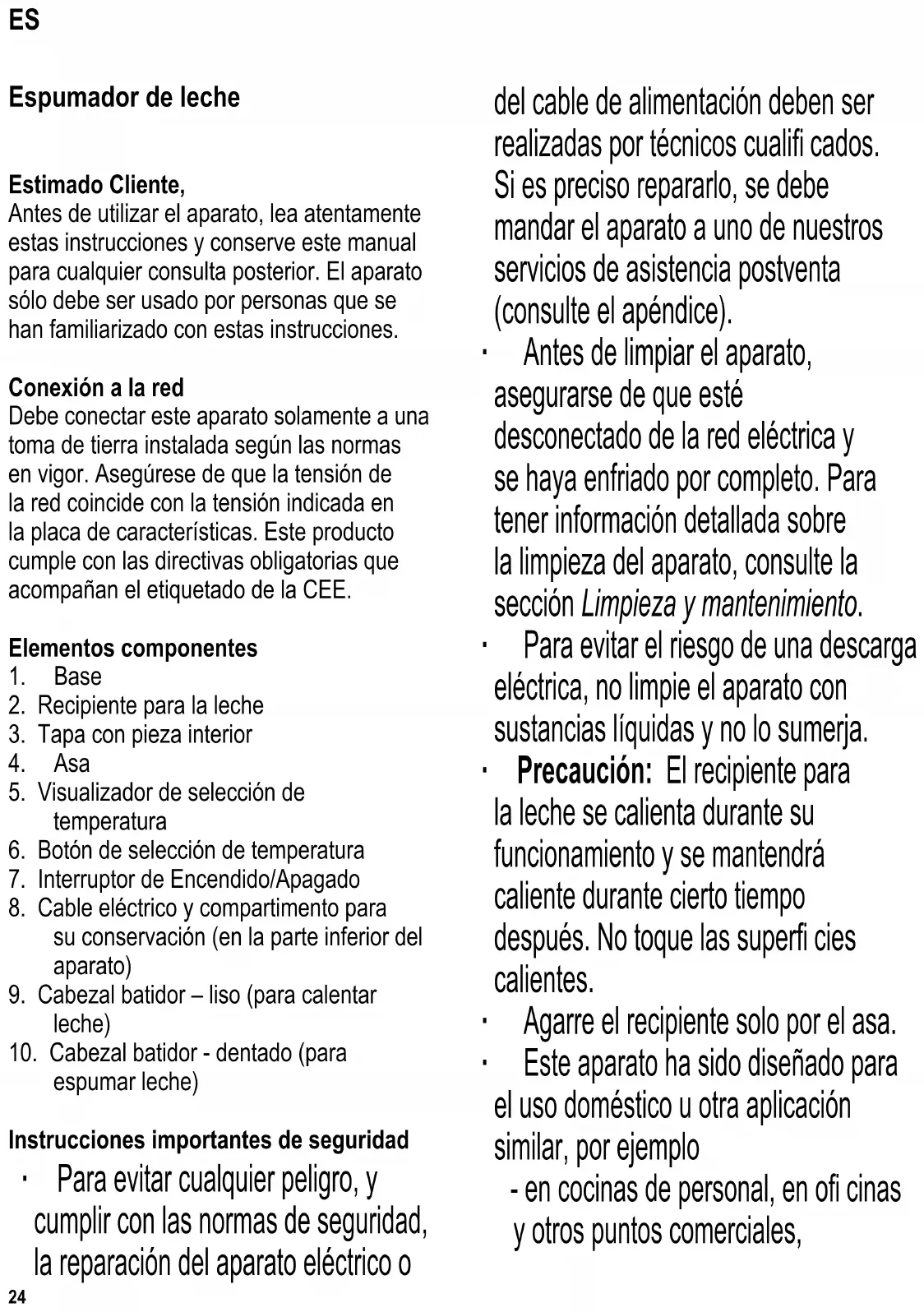 espumar leche) Instrucciones importantes de seguridad ∙ Para evitar cualquier peligro, y cumplir con las normas de seguridad, la reparación del aparato eléctrico o del cable de alimentación deben ser realizadas por técnicos cualifi cados. Si es preciso repararlo, se debe mandar el aparato a uno de nuestros servicios de asistencia postventa (consulte el apéndice). ∙ Antes de limpiar el aparato, asegurarse de que esté desconectado de la red eléctrica y se haya enfriado por completo. Para tener información detallada sobre la limpieza del aparato, consulte la sección Limpieza y mantenimiento. ∙ Para evitar el riesgo de una descarga eléctrica, no limpie el aparato con sustancias líquidas y no lo sumerja. ∙ Precaución: El recipiente para la leche se calienta durante su funcionamiento y se mantendrá caliente durante cierto tiempo después. No toque las superfi cies calientes. ∙ Agarre el recipiente solo por el asa. ∙ Este aparato ha sido diseñado para el uso doméstico u otra aplicación similar, por ejemplo - en cocinas de personal, en ofi cinas y otros puntos comerciales, ES25 - en empresas agrícolas, - por los clientes de hoteles, pensiones, etc. y alojamientos similares, - en casas rurales. ∙ Este aparato podrá ser utilizado por niños (mayores de 8 años) y personas con reducidas facultades físicas, sensoriales o mentales, o sin experiencia ni conocimiento del producto, siempre que hayan recibido la supervisión o instrucciones referentes al uso del aparato y entiendan por completo el peligro y las precauciones de seguridad. ∙ Los niños no deben jugar con el aparato. ∙ No se debe permitir que los niños realicen ningún trabajo de limpieza o mantenimiento del aparato a menos que esté bajo vigilancia y tengan más de 8 años. ∙ El aparato y su cable eléctrico siempre se deben mantener fuera del alcance de niños menores de 8 años. ∙ Precaución: Mantenga a los niños alejados del material de embalaje, porque podría ser peligroso, existe el peligro de asfi xia. ∙ Antes de utilizar el aparato, siempre se debe comprobar que tanto la unidad principal, el cable de alimentación como cualquier accesorio no están defectuosos. En caso de que el aparato haya caído sobre una superfi cie dura, o se haya tirado en exceso del cable de alimentación, no se deberá utilizar de nuevo: incluso los desperfectos no visibles pueden tener efectos adversos sobre la seguridad en el uso del aparato. ∙ Este aparato ha sido diseñado exclusivamente para calentar y espumar leche. No introduzca ningún otro tipo de líquido o alimento sólido en el recipiente. ∙ No deje el espumador de leche funcionando sin supervisión. ∙ Respete siempre las señales de nivel mínimo y máximo del interior del recipiente en cada utilización. ∙ El saliente de la parte inferior del recipiente (señal de nivel mín.) debe estar cubierto de leche. Si no existe sufi ciente leche, el aparato se podría sobrecalentar. ∙ Para evitar el sobrecalentamiento, el aparato se apagará automáticamente si se intenta poner en funcionamiento vacío. ∙ Precaución: Llenar excesivamente el recipiente puede ser peligroso porque la leche espumada podría salir. ∙ Precaución: La tapa debe estar cerrada durante el funcionamiento. Para añadir ingredientes mientras el aparato está funcionando, siempre debe utilizar la apertura de la tapa. ∙ El aparato solo se debe utilizar con los accesorios originales suministrados por el fabricante. ∙ El aparato siempre se debe montar sobre26 una superfi cie plana y fi rme. ∙ No deje que la caja ni el cable entren en contacto con llamas ni con ninguna superfi cie caliente tales como platos muy calientes. ∙ No permita que el cable eléctrico cuelgue suelto; se debe mantener el cable sufi cientemente alejado de las partes calientes del aparato. ∙ Desenchufe siempre el aparato - si hay una avería, - después del uso, y - antes de limpiarlo. ∙ Cuando se desenchufa la clavija de la pared, nunca tirar del cable de alimentación. ∙ No se acepta responsabilidad alguna si hay averías a consecuencia del uso incorrecto del aparato o si estas instrucciones no han sido observadas debidamente. Antes de usarlo por primera vez Retire todo el material de embalaje y compruebe que tiene todos los componentes. Antes de utilizar el aparato por vez primera, o tras largos períodos de no utilización, se debe limpiar meticulosamente como viene indicado en la sección Limpieza y mantenimiento. Funcionamiento Se recomienda utilizar leche uperisada (UHT) desnatada (1,5% de grasa). Para obtener mejores resultados, se debe sacar la leche del frigorífi co inmediatamente antes de espumarla. La base del recipiente y la zona de contacto en el interior de la base deben estar limpia y seca. Seleccionar el cabezal batidor ∙ Utilice el cabezal batidor liso para calentar la leche. ∙ Para espumar y calentar la leche, utilice el cabezal dentado. ∙ Para espumar en frío, utilice también el cabezal dentado. ∙ Durante periodos de no utilización, los cabezales batidores se pueden guardar en la parte posterior de la carcasa. Nivel de llenado ∙ Respete la señal de nivel mínimo de llenado y compruebe que el recipiente contiene al menos 120 ml de leche. ∙ Para espumar leche, llene el recipiente con un máximo de 350 ml (señal inferior de nivel máx