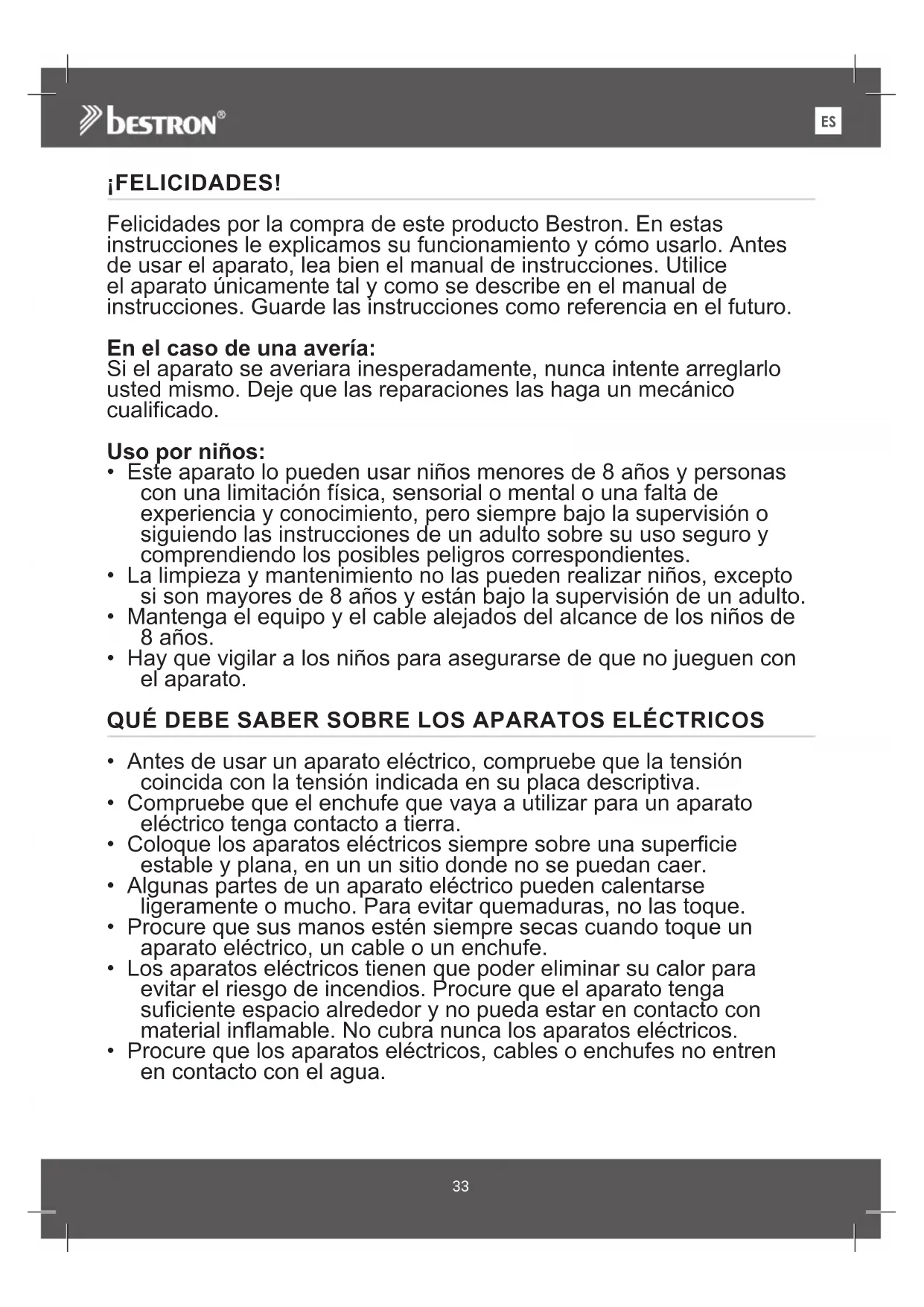 ¡FELICIDADES! Felicidades por la compra de este producto Bestron. En estas instrucciones le explicamos su funcionamiento y cómo usarlo. Antes de usar el aparato, lea bien el manual de instrucciones. Utilice el aparato únicamente tal y como se describe en el manual de instrucciones. Guarde las instrucciones como referencia en el futuro. En el caso de una avería: Si el aparato se averiara inesperadamente, nunca intente arreglarlo usted mismo. Deje que las reparaciones las haga un mecánico cualificado. Uso por niños:
