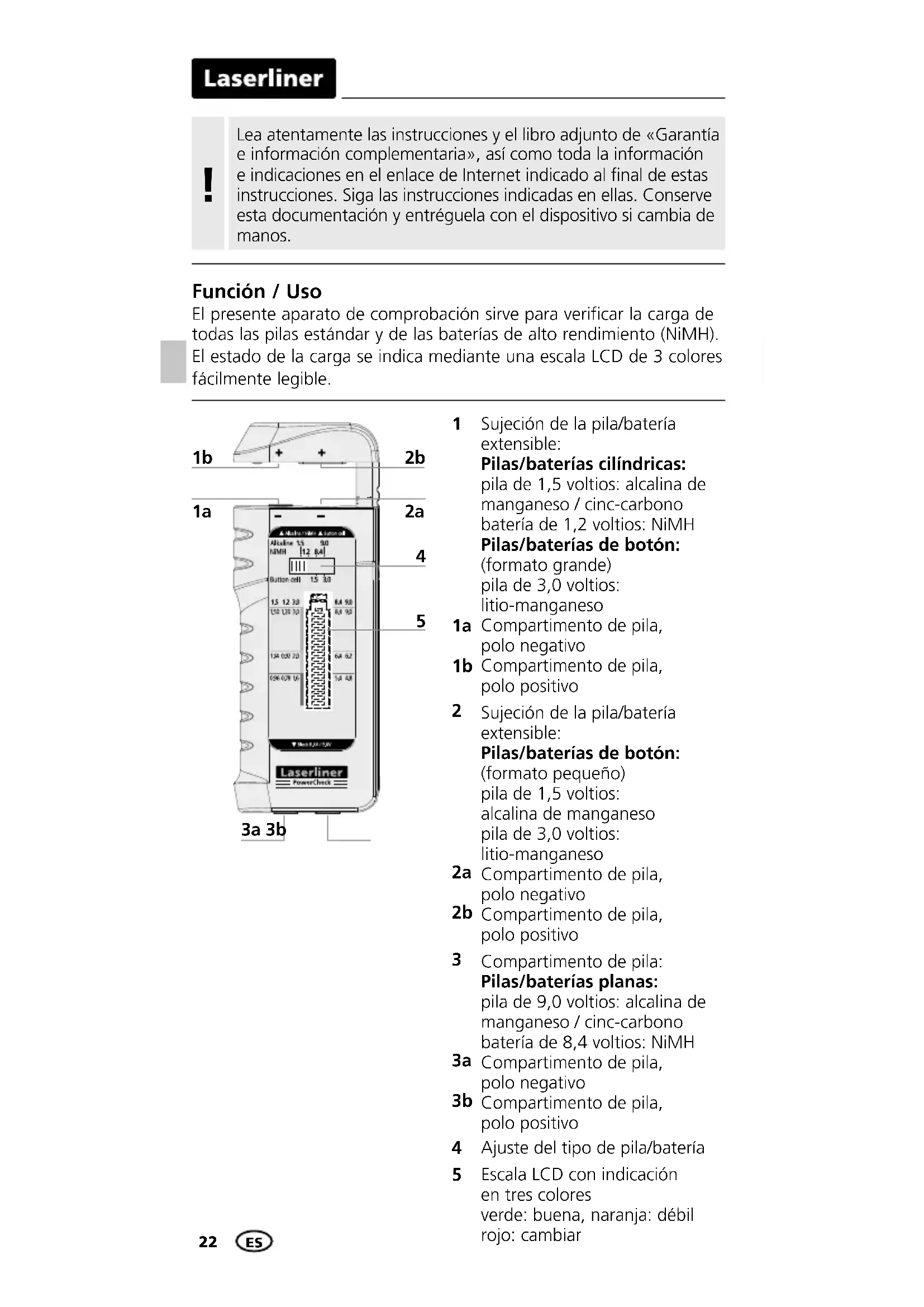 Función / Uso El presente aparato de comprobación sirve para verificar la carga de todas las pilas estándar y de las baterías de alto rendimiento (NiMH). El estado de la carga se indica mediante una escala LCD de 3 colores fácilmente legible. Sujeción de la pila/batería extensible: Pilas/baterías cilíndricas: pila de 1,5 voltios: alcalina de manganeso / cinc-carbono batería de 1,2 voltios: NiMH Pilas/baterías de botón: (formato grande) pila de 3,0 voltios: litio-manganeso Compartimento de pila, polo negativo Compartimento de pila, polo positivo Sujeción de la pila/batería extensible: Pilas/baterías de botón: (formato pequeño) pila de 1,5 voltios: alcalina de manganeso pila de 3,0 voltios: litio-manganeso Compartimento de pila, polo negativo Compartimento de pila, polo positivo Compartimento de pila: Pilas/baterías planas: pila de 9,0 voltios: alcalina de manganeso / cinc-carbono batería de 8,4 voltios: NiMH Compartimento de pila, polo negativo Compartimento de pila, polo positivo Ajuste del tipo de pila/batería Escala LCD con indicación en tres colores verde: buena, naranja: débil rojo: cambiar