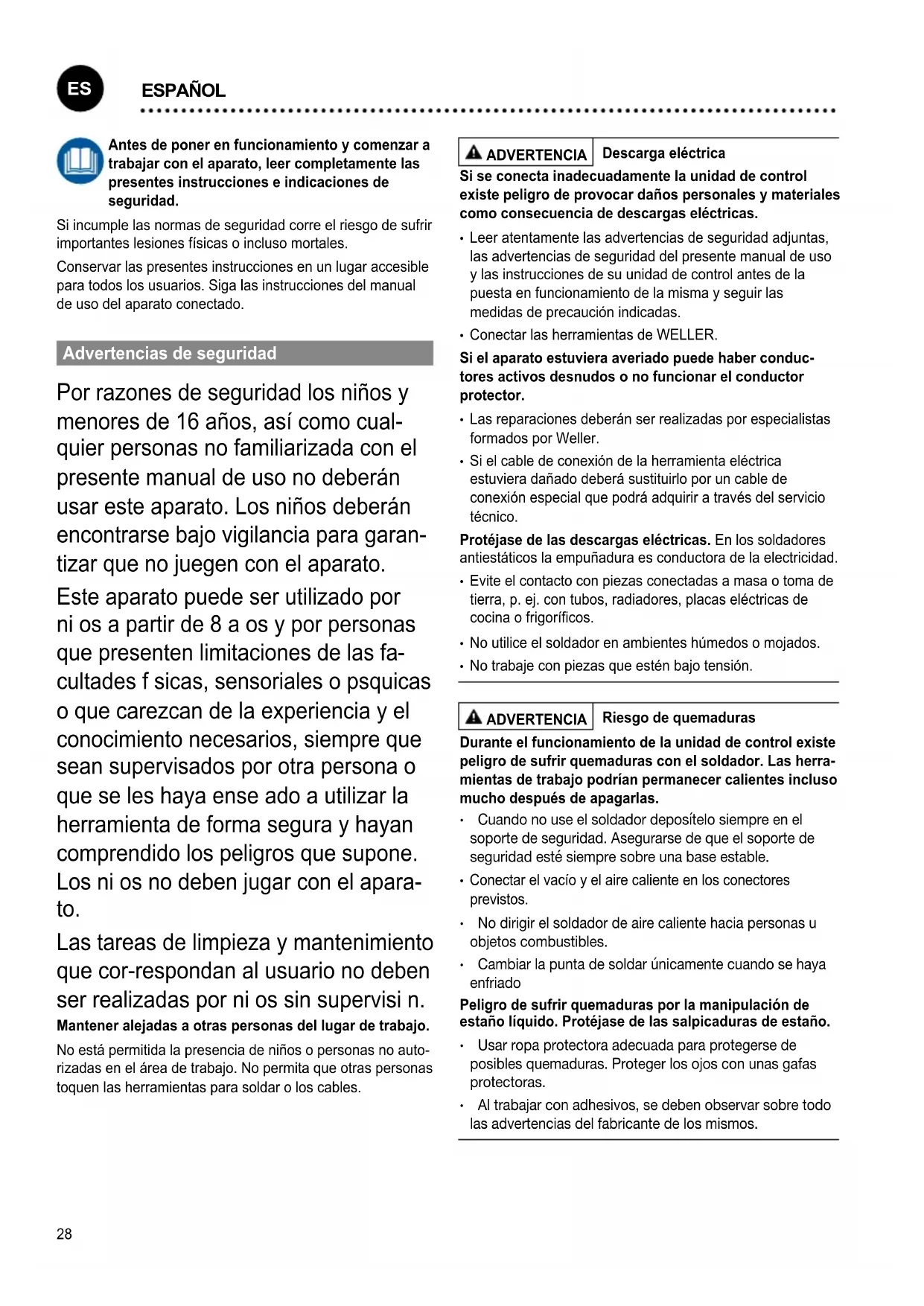 quidos o gases inamables cerca del soldador. El cable de la corriente eléctrica debe enchufarse únicamente en tomas de corriente (enchufe hembra) o en adaptadores homologados. Compruebesilatensión deredcoincideconlaindicadaenlaplacadecaracterísti- cas.Asegurarsequelamáquinaestádesconectadaantes deenchufarla. Utilice el cable nicamente para aquellos nes para los que ha sido previsto.No sujetar nunca el aparato por el cable. No tire nunca del cable para desenchufar el enchufe de la toma de corriente. Proteja el cable del calor, de manchas de aceite y de cantos alados.. Preste atención. Prestar atención a lo que se hace. Realizar el trabajo con sentido común. No utilice el soldador cuando esté desconcentrado. Evite posturas incorrectas. La conguración del lugar de trabajo debe ser ergonómica. Evitar posturas incorrectas durante el trabajo, ya que dan lugar a lesiones. Utilice el soldador únicamente cuando esté en perfecto estado. Los dispositivos de protección no deben ponerse fuera de servicio. Las averías y los defectos deben solucionarse inme- diatamente. Antes de cada uso del aparato o herramienta, debe comprobarse minuciosamente que los dispositivos de seguridad funcionan a la perfección y de la forma prevista. Comprobar que las piezas móviles funcionan perfectamente, que no se atascan y que no están dañadas. Para garantizar el correcto funcionamiento del aparato, todas las piezas deberán estar montadas correctamente y cumplir todos los requisitos. Usar la herramienta adecuada. Utilizar solo accesorios o aparatos complementarios que estén incluidos en la lista de accesorios o que estén aprobados por el fabricante. Utilizar los accesorios o aparatos complementarios WELLER solamente en aparatos WELLER originales. El uso de otras herramientas y otros accesorios puede implicar el riesgo de sufrir lesiones. Asegurar la herramienta. Utilizar dispositivos de sujeción para jar la pieza de trabajo. Usar un equipo de aspiración de humos de soldadura. Si se dispone de dispositivos para la conexión de equipos de aspiración de humos de soldadura, asegúrese de que estos estén bien conectados y de que se usen correctamente. Aplicación De Acuerdo A La Finalidad Unidad de alimentación para herramientas WX de WELLER. Utilice la estación de soldar / desoldar / de aire caliente únicamente para el uso especicado en el manual de instrucciones, es decir, para soldar y desoldar, siguiendo siempre las indicaciones del presente documento. ADVERTENCIA No está permitido aspirar líquidos ni gases inamables. El aparato deberá usarse siempre con los cartuchos ltrantes correctamente colocados. Sustituir los cartuchos ltrantes que estén llenos. Sólo está permitido usar este aparato a temperatura ambien- te y en interiores. Proteger de la humedad y de la radiación directa del sol. Grupo de usuarios Debido a los diferentes tipos de riesgo y el potencial de riesgo algunas operaciones deberán ser realizadas exclusi- vamente por especialistas. Operación Grupo de usuarios Parámetros para soldar Especialista con formación técnica Sustitución de piezas de recambio eléctricas Electricista Intervalos de manteni- miento Especialista en seguridad Manejo Cambio de ltro Usuarios normales Manejo Cambio de ltro Sustitución de piezas de recambio eléctricas Personas en periodo de formación bajo la supervisión y dirección de una persona experimentada Cuidado y mantenimiento ADVERTENCIA Antes de realizar cualquier trabajo en la máquina, desen- chufarla de la alimentación eléctrica. Dejar que se enfríe el aparato. Si estuviera sucio, limpiar el panel de control con un paño adecuado. Cerrar las interfaces no utilizadas con sus tapas. Comprobar periódicamente todos los cables y mangueras conectados. Retirar las herramientas eléctricas defectuosas inmediatamente para que no se sigan utilizando.