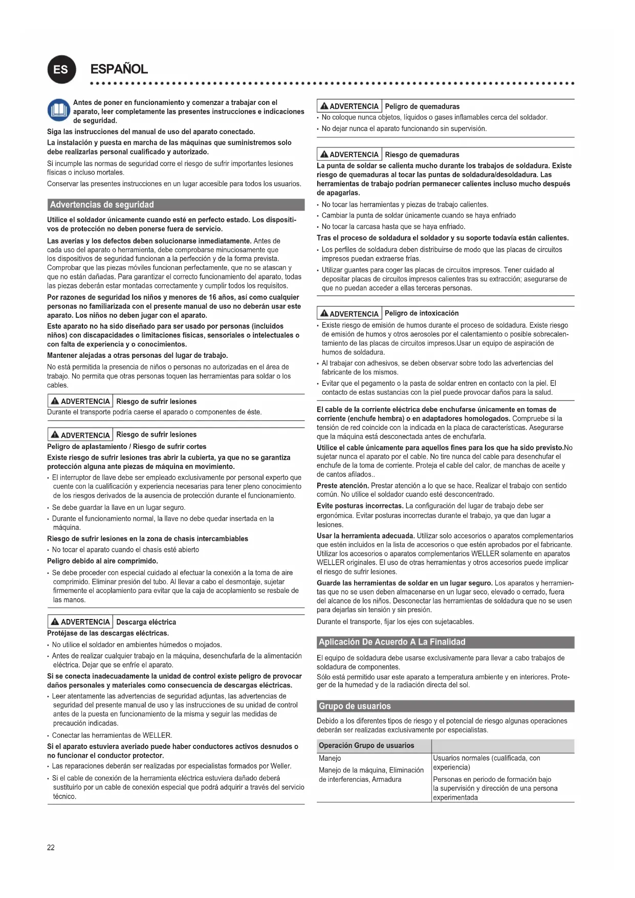 - Evitar que el pegamento o la pasta de soldar entren en contacto con la piel. El contacto de estas sustancias con la piel puede provocar daños para la salud. El cable de la corriente eléctrica debe enchufarse únicamente en tomas de corriente (enchufe hembra) o en adaptadores homologados. Compruebe si la tensión de red coincide con la indicada en la placa de características. Asegurarse que la máquina está desconectada antes de enchufarla. Utilice el cable nicamente para aquellos nes para los que ha sido previsto.No sujetar nunca el aparato por el cable. No tire nunca del cable para desenchufar el enchufedelatomadecorriente.Protejaelcabledelcalor,demanchasdeaceitey decantosalados.. Preste atención. Prestar atención a lo que se hace. Realizar el trabajo con sentido común.Noutiliceelsoldadorcuandoestédesconcentrado. Evite posturas incorrectas. Laconguracióndellugardetrabajodebeser ergonómica.Evitarposturasincorrectasduranteeltrabajo,yaquedanlugara lesiones. Usar la herramienta adecuada. Utilizar solo accesorios o aparatos complementarios que estén incluidos en la lista de accesorios o que estén aprobados por el fabricante. Utilizar los accesorios o aparatos complementarios WELLER solamente en aparatos WELLERoriginales.Elusodeotrasherramientasyotrosaccesoriospuedeimplicar el riesgo de sufrir lesiones. Guarde las herramientas de soldar en un lugar seguro.Losaparatosyherramien- tas que no se usen deben almacenarse en un lugar seco, elevado o cerrado, fuera del alcance de los niños. Desconectar las herramientas de soldadura que no se usen paradejarlassintensiónysinpresión. Duranteeltransporte,jarlosejesconsujetacables. Aplicación De Acuerdo A La Finalidad El equipo de soldadura debe usarse exclusivamente para llevar a cabo trabajos de soldadura de componentes. Sóloestápermitidousaresteaparatoatemperaturaambienteyeninteriores.Prote- gerdelahumedadydelaradiacióndirectadelsol. Grupo de usuarios Debidoalosdiferentestiposderiesgoyelpotencialderiesgoalgunasoperaciones deberánserrealizadasexclusivamenteporespecialistas. Operación Grupo de usuarios Manejo Manejodelamáquina,Eliminación de interferencias, Armadura Usuariosnormales(cualicada,con experiencia) Personas en periodo de formación bajo lasupervisiónydireccióndeunapersona experimentada