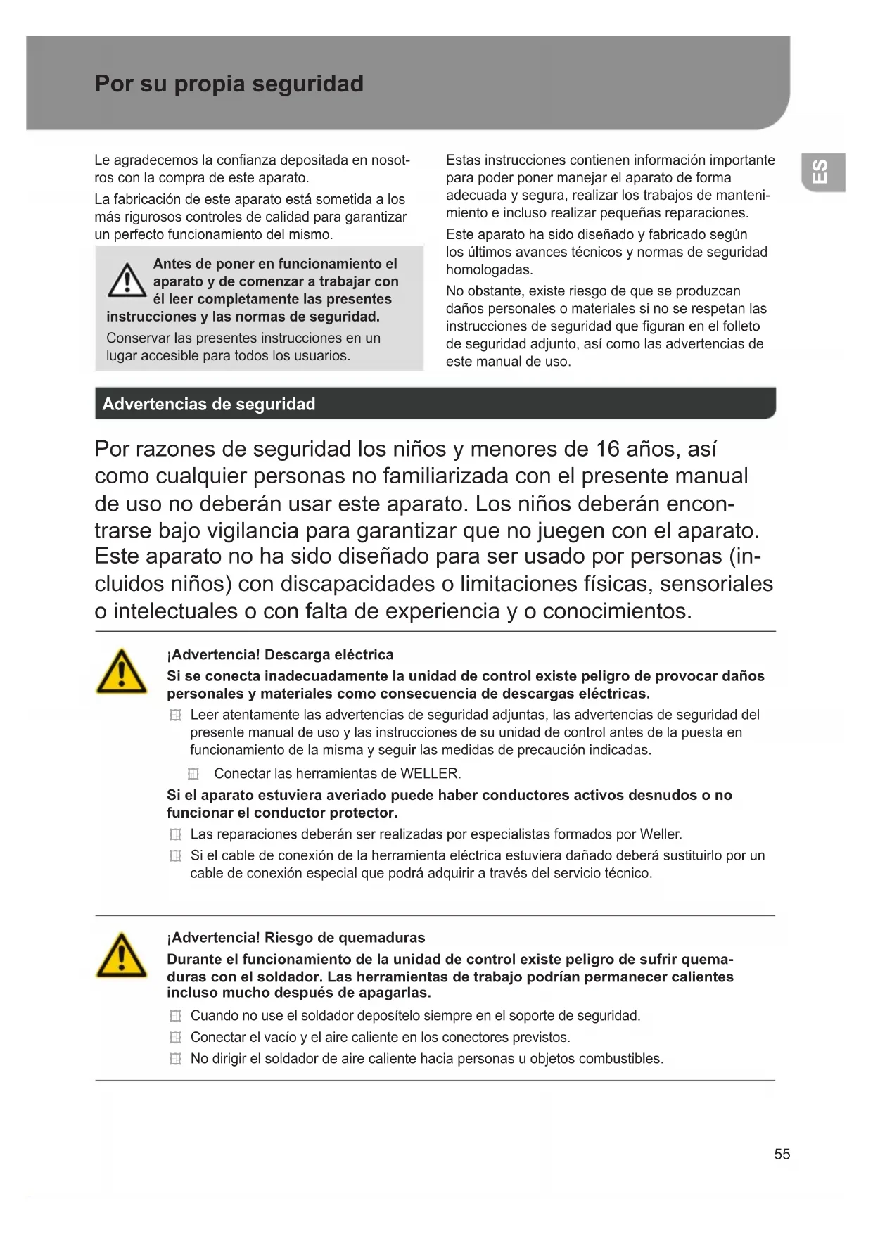 EN53 Error messages and error clearance Message/symptom Possible cause Remedial measures Display:„--- Tool has not been detected Tool defective Check connection of tool to device Check connected tool Nodisplayfunction(display OFF) Nomainssupplyvoltage Turn on mains power switch Checkmainssupplyvoltage Check device fuse No vacuum at desoldering tool Vakuum nicht angeschlossen Desoldering nozzle clogged Pumpfaulty Connect vacuum hose to vacuum connection Service desoldering nozzle using cleaning tool Insufcientvacuumatdesolde- ring tool Filter cartridge on desoldering tool full Mainlterfull Changeltercartridgeon desoldering tool full Changethemainlterelement on the soldering station Hot air tool has no air Air hose not connected Mainlterfull Connect or check air hose Changethemainlterelement on the soldering station Technical Data EN54 Symbols Caution! Readtheoperatinginstructions! Beforeperformingworkofany kindontheunit,alwaysdiscon- nect the power plug from the socket. ESD-compatible design and ESD- compatible workstation Equipotential bonding CEmarkofconformity BritishConformityMark Fuse Safetytransformer Soldering Desoldering Hot air Disposal Waste light sources have to be remo- vedfromequipment.Checkwithyour localauthorityorretailerforrecycling advice and collection point. According tolocalregulationsretailersmayhave an obligation to take back waste elec- trical and electronic equipment free of charge. Your contribution to re-use andrecyclingofwasteelectricaland electronic equipment helps to reduce the demand of raw materials. Waste electrical and electronic equipment containvaluable,recyclablemateri- als,whichcanadverselyimpactthe environment and the human health, if notdisposedofinanenvironmentally compatible manner. Delete personal datafromwasteequipment,ifany. Contaminatedltersmustbetreated as special waste. Dispose of repla- cedequipmentparts,ltersorold devices in accordance with the rules andregulationsapplicableinyour country. Warranty Claimsbythebuyerforphysicaldefectsaretime- barredafteraperiodofoneyearfromdeliveryto thebuyer.Thisdoesnotapplytoclaimsbythe buyerforindemnicationinaccordancewith§§ 478, 479 BGB (German Federal Law Gazette). Weshallonlybeliableforclaimsarisingfroma warrantyfurnishedbyusifthequalityordurability warrantyhasbeenfurnishedbyuseinwritingand usingtheterm„Warranty“. Thewarrantyshallbevoidifdamageisdueto improper use and if the device has been tampered withbyunauthorizedpersons. Subject to technical alterations and amendments. For more information please visit www.weller-tools.com. Technical Data EN55 Por su propia seguridad Leagradecemoslaconanzadepositadaennosot- ros con la compra de este aparato. Lafabricacióndeesteaparatoestásometidaalos másrigurososcontrolesdecalidadparagarantizar un perfecto funcionamiento del mismo. Antes de poner en funcionamiento el aparato y de comenzar a trabajar con él leer completamente las presentes instrucciones y las normas de seguridad. Conservar las presentes instrucciones en un lugar accesible para todos los usuarios. Estas instrucciones contienen información importante para poder poner manejar el aparato de forma adecuadaysegura,realizarlostrabajosdemanteni- miento e incluso realizar pequeñas reparaciones. Esteaparatohasidodiseñadoyfabricadosegún losúltimosavancestécnicosynormasdeseguridad homologadas. No obstante, existe riesgo de que se produzcan daños personales o materiales si no se respetan las instruccionesdeseguridadqueguranenelfolleto deseguridadadjunto,asícomolasadvertenciasde este manual de uso. Advertencias de seguridad Porrazonesdeseguridadlosniñosymenoresde16años,así como cualquier personas no familiarizada con el presente manual deusonodeberánusaresteaparato.Losniñosdeberánencon- trarse bajo vigilancia para garantizar que no juegen con el aparato. Este aparato no ha sido diseñado para ser usado por personas (in- cluidosniños)condiscapacidadesolimitacionesfísicas,sensoriales ointelectualesoconfaltadeexperienciayoconocimientos. ¡Advertencia! Descarga eléctrica Si se conecta inadecuadamente la unidad de control existe peligro de provocar daños personales y materiales como consecuencia de descargas eléctricas. Leer atentamente las advertencias de seguridad adjuntas, las advertencias de seguridad del presentemanualdeusoylasinstruccionesdesuunidaddecontrolantesdelapuestaen funcionamientodelamismayseguirlasmedidasdeprecauciónindicadas. Conectar las herramientas de WELLER. Si el aparato estuviera averiado puede haber conductores activos desnudos o no funcionar el conductor protector. LasreparacionesdeberánserrealizadasporespecialistasformadosporWeller. Sielcabledeconexióndelaherramientaeléctricaestuvieradañadodeberásustituirloporun cabledeconexiónespecialquepodráadquiriratravésdelserviciotécnico. ¡Advertencia! Riesgo de quemaduras Durante el funcionamiento de la unidad de control existe peligro de sufrir quema- duras con el soldador. Las herramientas de trabajo podrían permanecer calientes incluso mucho después de apagarlas. Cuandonouseelsoldadordeposítelosiempreenelsoportedeseguridad. Conectarelvacíoyelairecalienteenlosconectoresprevistos. No dirigir el soldador de aire caliente hacia personas u objetos combustibles. ES56 ¡Advertencia! ¡Peligro de incendio y explosión! Peligro de incendio debido a herramientas o utensilios calientes Cuandonouseelsoldadordeposítelosiempreenelsoportedeseguridad. No dirigir el soldador de aire caliente hacia personas u objetos combustibles. Manteneralejadoslosobjetosexplosivosoinamables. No cubrir el aparato. ¡Advertencia! Riesgo de sufrir lesiones Duranteeltransportepodríacaerseelaparadoocomponentesdeéste. Aplicación De Acuerdo A La Finalidad Unidad de alimentación para herramientas de WELLER. Utilizar la estación de reparación exclusivamente paralanalidadprevistaenelmanualdeuso,es decirparasoldarydesoldarenlascondiciones mencionadas en el manual. Noestápermitidoaspirarlíquidosni gasesinamables. Elaparatodeberáusarsesiem