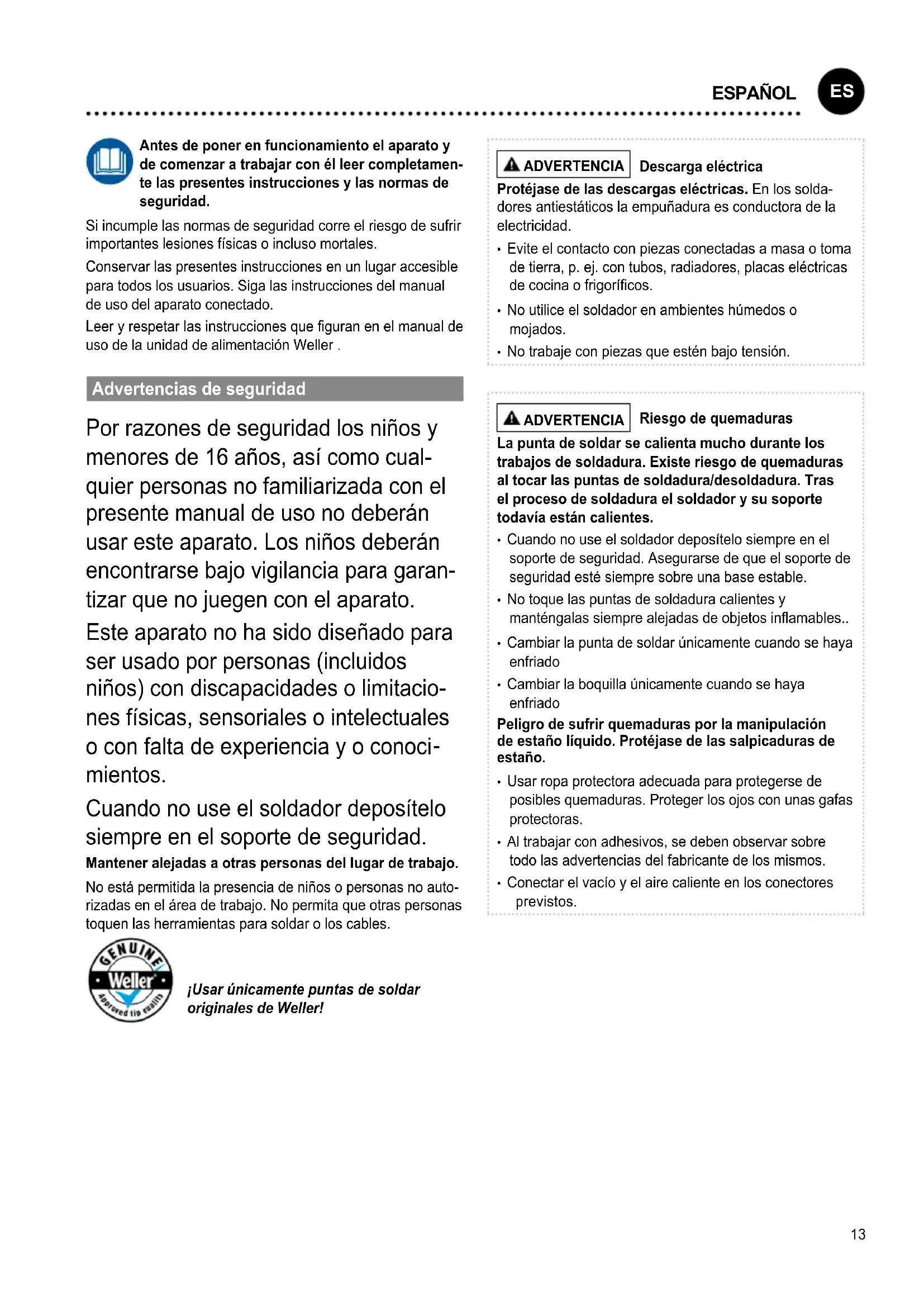 mientos. Cuando no use el soldador deposítelo siempre en el soporte de seguridad. Mantener alejadas a otras personas del lugar de trabajo. No está permitida la presencia de niños o personas no auto- rizadas en el área de trabajo. No permita que otras personas toquen las herramientas para soldar o los cables. ¡Usar únicamente puntas de soldar originales de Weller! ADVERTENCIA Descarga eléctrica Protéjase de las descargas eléctricas. En los solda- dores antiestáticos la empuñadura es conductora de la electricidad.