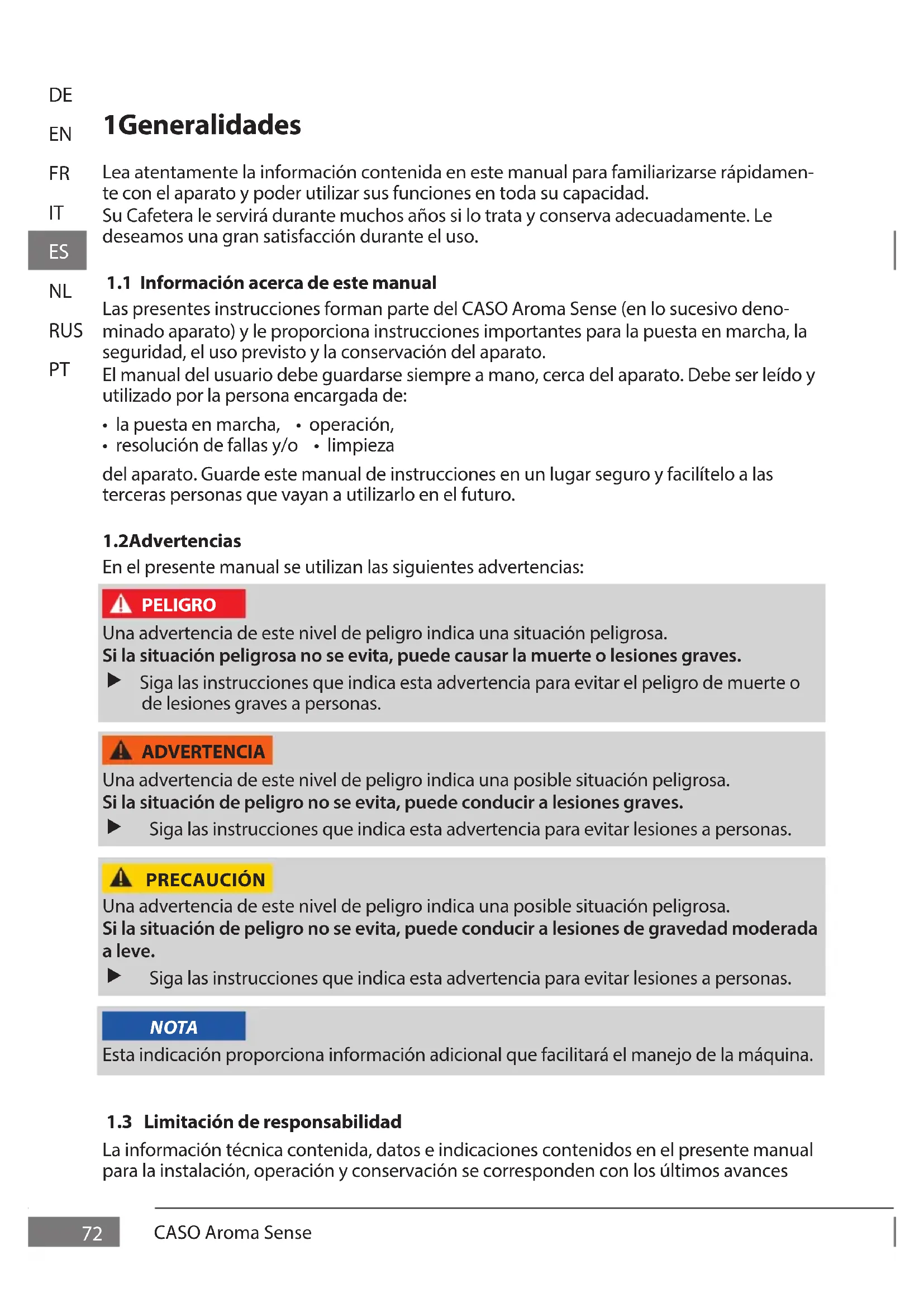 Las presentes instrucciones forman parte del CASO Aroma Sense (en lo sucesivo deno- minado aparato) y le proporciona instrucciones importantes para la puesta en marcha, la seguridad, el uso previsto y la conservación del aparato. El manual del usuario debe guardarse siempre a mano, cerca del aparato. Debe ser leído y utilizado por la persona encargada de: