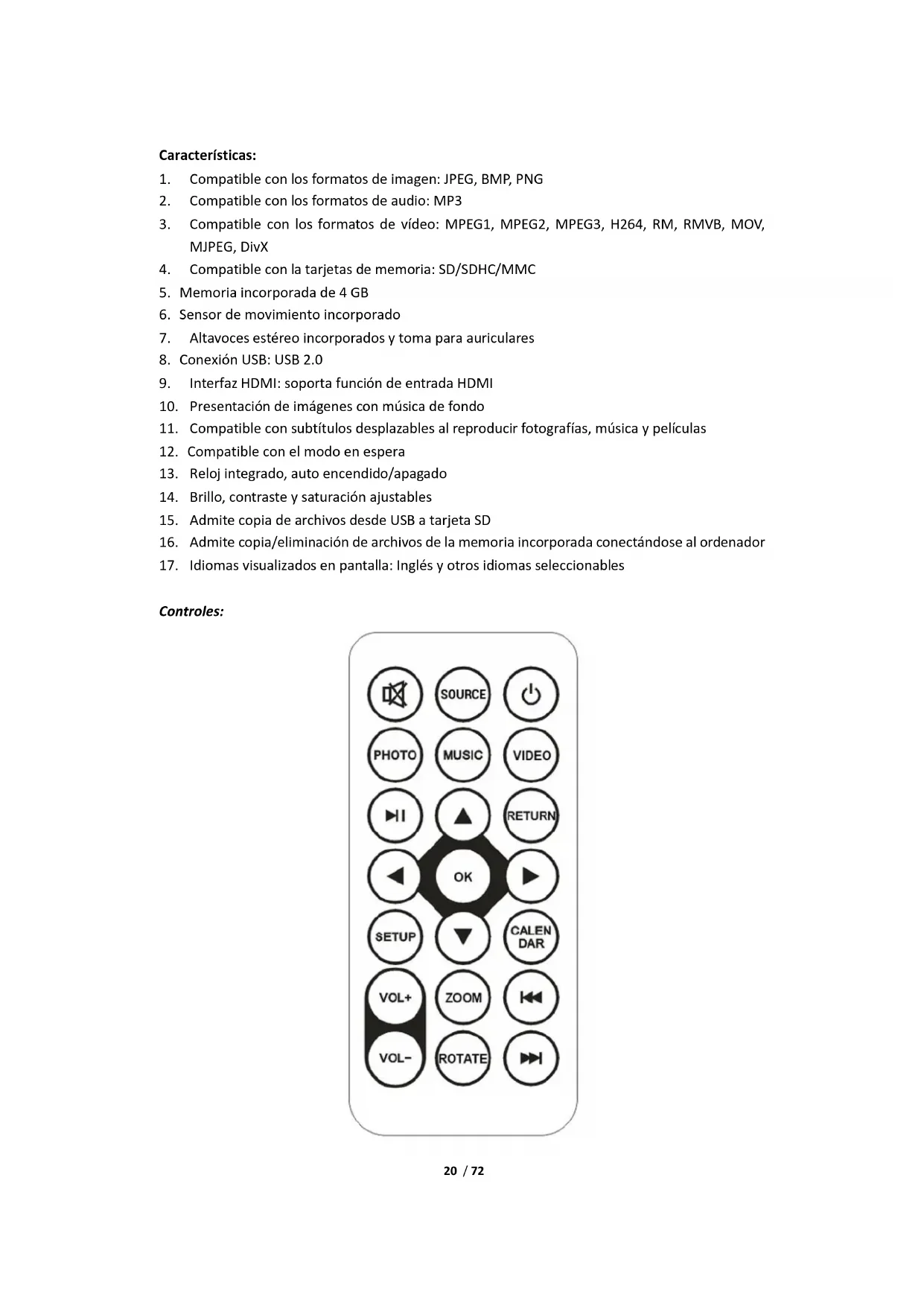 Menú principal: Compatible con SD/SDHC/MMC y USB 2.0. Presione para acceder a los menús de configuración de fotografía, música, vídeo y calendario. Presione el botón OK para confirmar la selección. Nota: Asegúrese de que en el dispositivo USB hay archivos de imagen, música o vídeo compatibles en la tarjeta de memoria.22 / 72 Modo de Imagen: En el menú principal marque Photo, presione OK para seleccionar el dispositivo USB o la tarjeta de memoria a reproducir y presione RETURN para acceder al modo miniatura. Presione para seleccionar la fotografía a reproducir y OK para confirmar.
